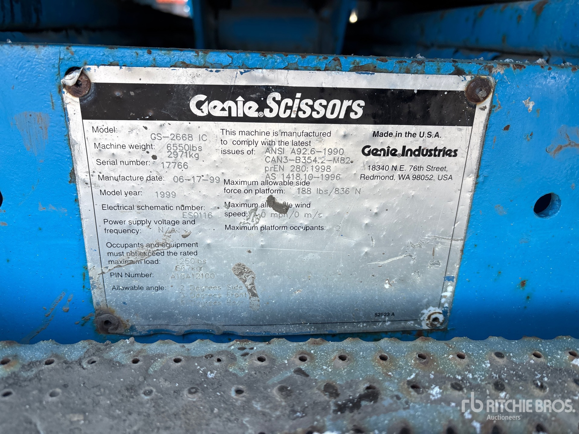 Szczegółowe informacje o sprzęcie mają ograniczony zakres, a firma Ritchie Bros. Auctioneers nie sprawdzała żadnych aspektów ani komponentów urządzenia innych niż wyraźnie określone w niniejszym dokumencie. O ile nie zostało to wyraźnie stwierdzone, nie składamy żadnych oświadczeń ani gwarancji, wyraźnych lub dorozumianych, dotyczących sprzętu lub jego komponentów, w tym między innymi oświadczeń lub gwarancji dotyczących funkcjonalności lub zgodności z jakąkolwiek normą bezpieczeństwa bądź wymogami jakiegokolwiek właściwego organu lub organu regulacyjnego, przydatności do określonego celu lub przydatności handlowej. Zdecydowanie zaleca się przeprowadzenie własnej szczegółowej inspekcji sprzętu przed złożeniem oferty.