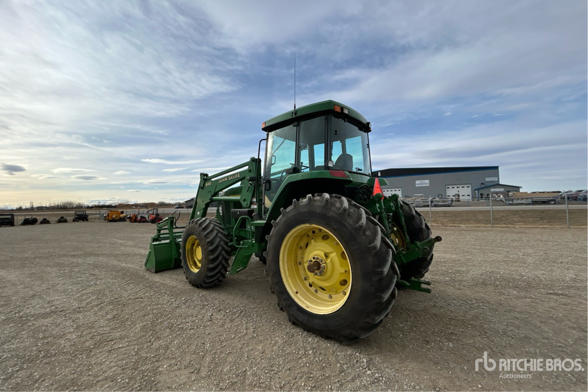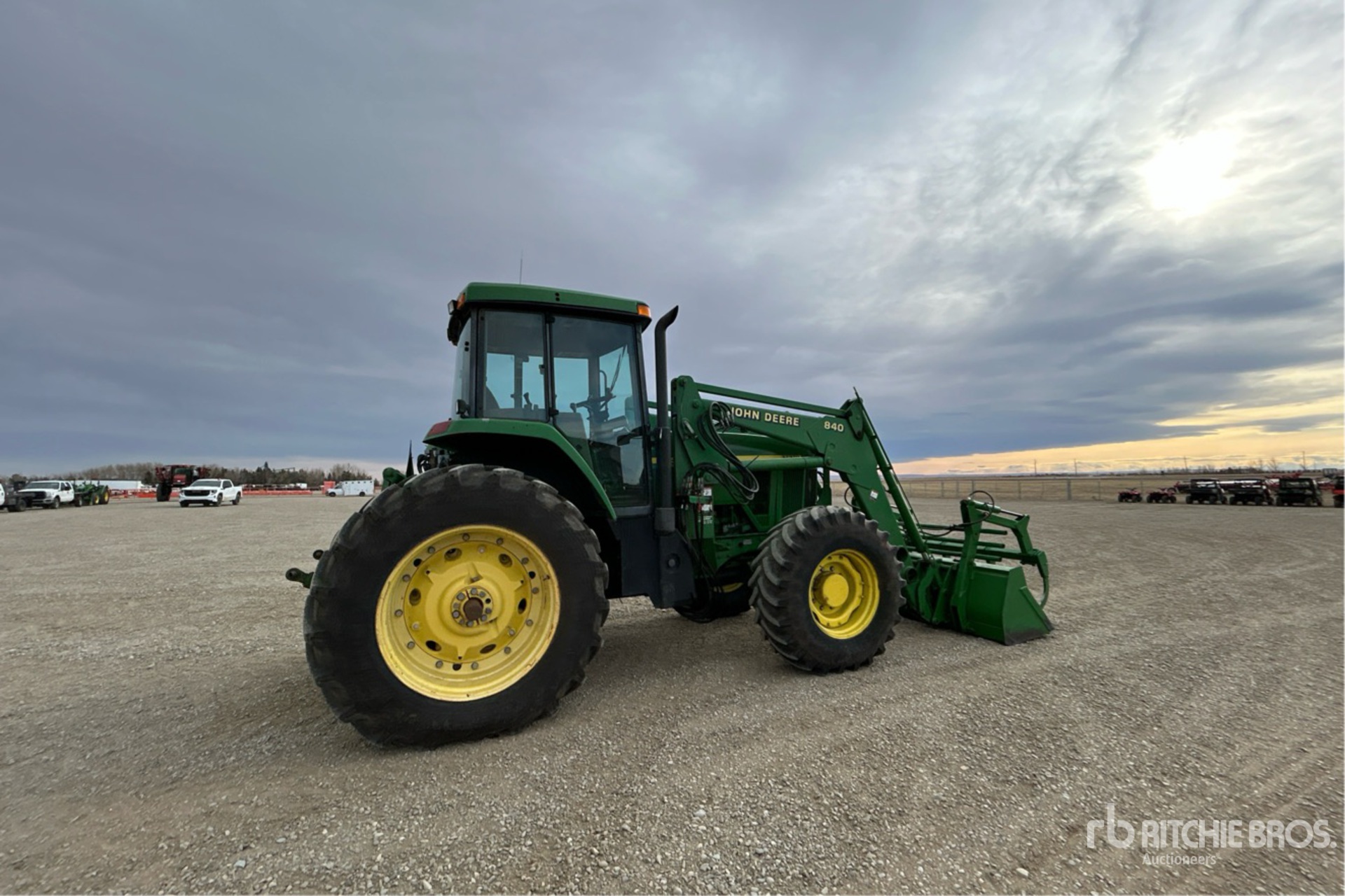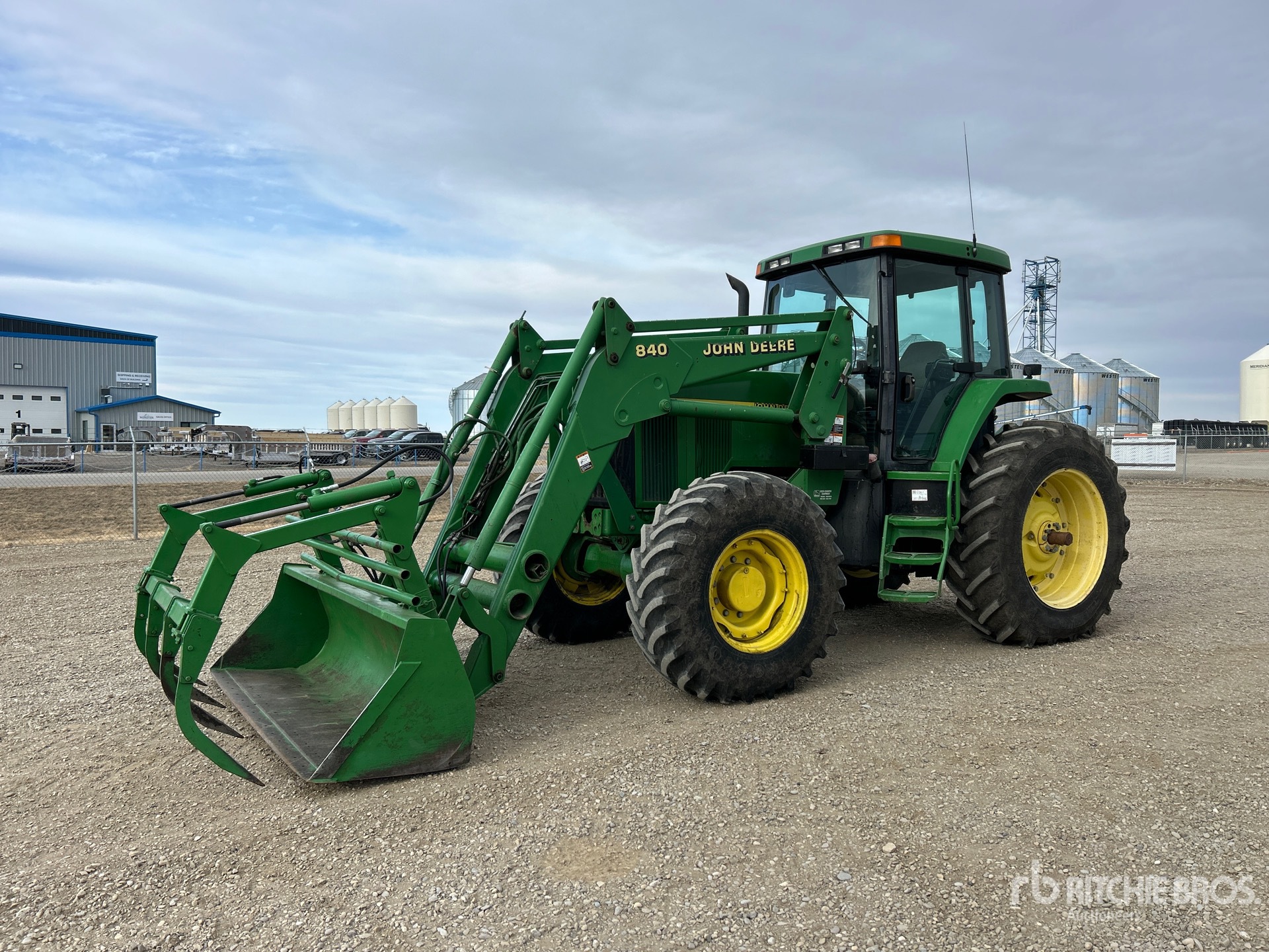 Enclosed Cab, Air Conditioner, Differential Lock, 16 Forward, Partial Powershift, Left Hand Reverser, 2000 US EPA Label, John Deere 840 Loader w/Joystick, Quick Coupler, 95 in Grapple Bucket, 3 Rear Remotes, 1000 PTO, Drawbar, 420/85R26 Front Tires, 460/85R38 Rear Tires, Rear Wheel Weights