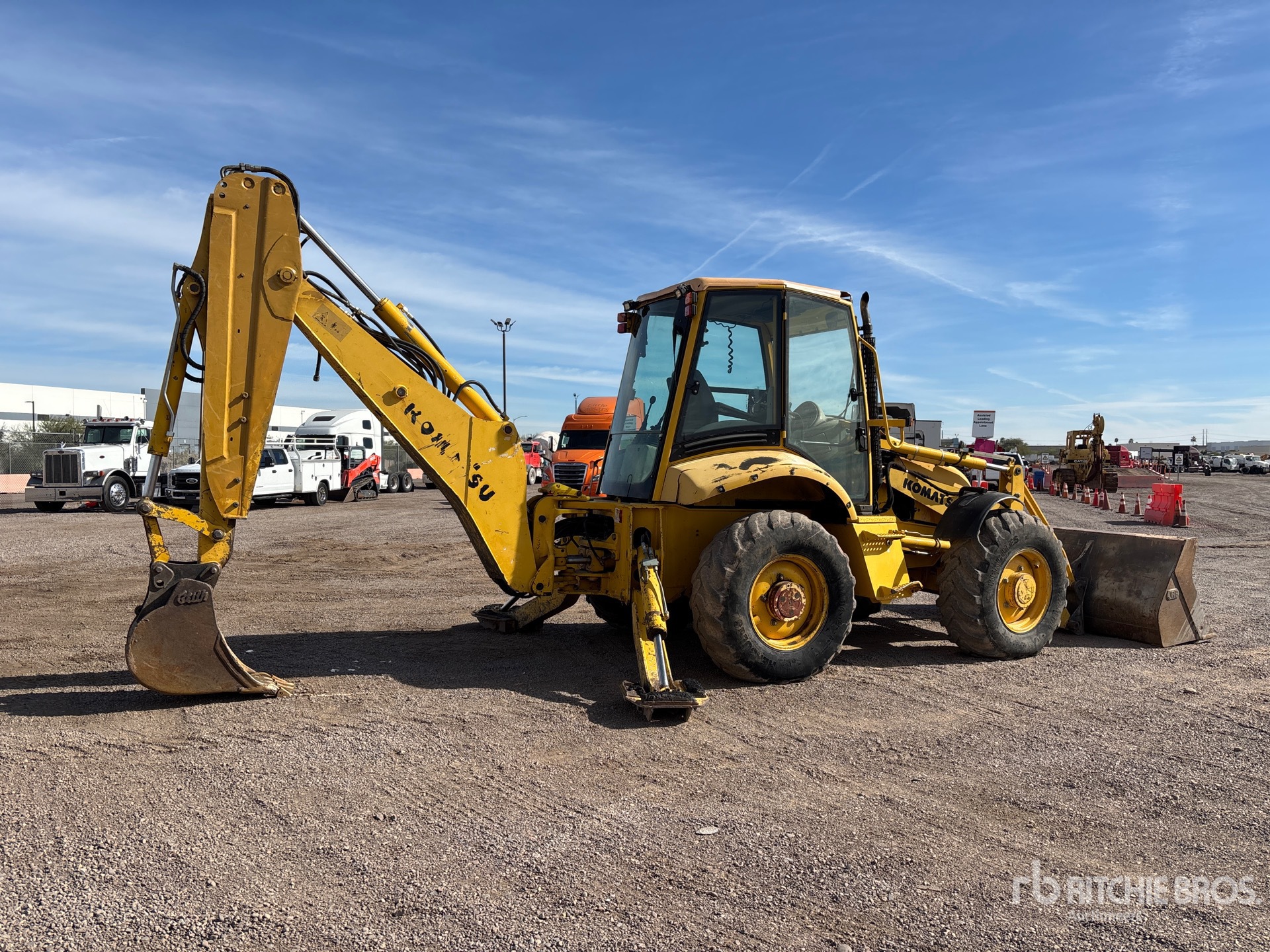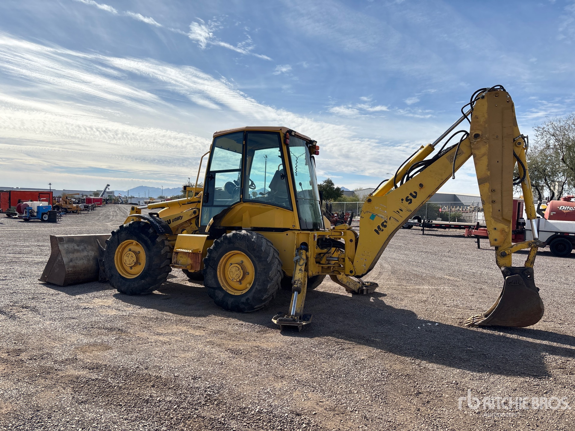 Enclosed Cab, 100 in Loader Bucket, Extendable Stick, 16 in Backhoe Digging Bucket