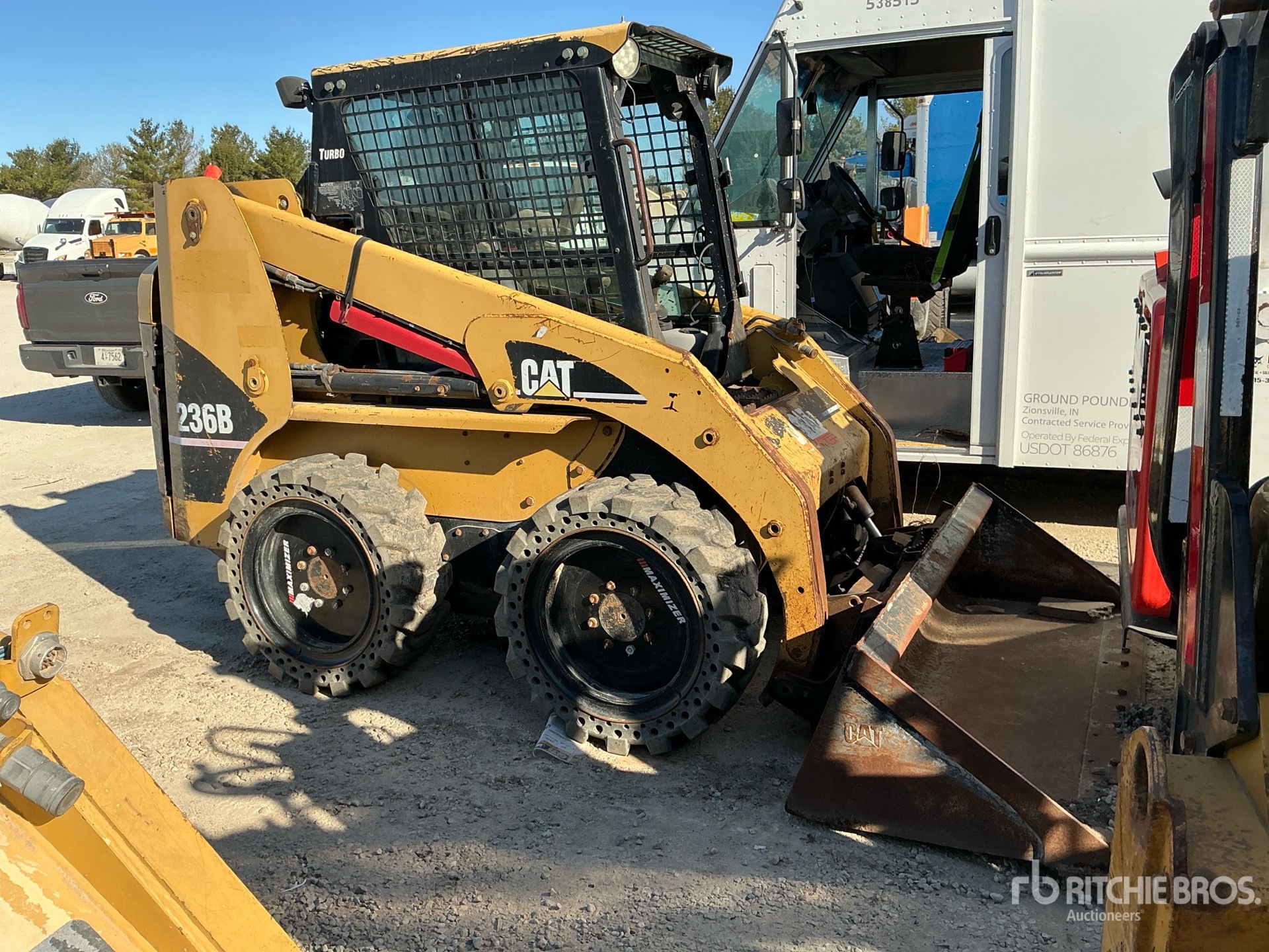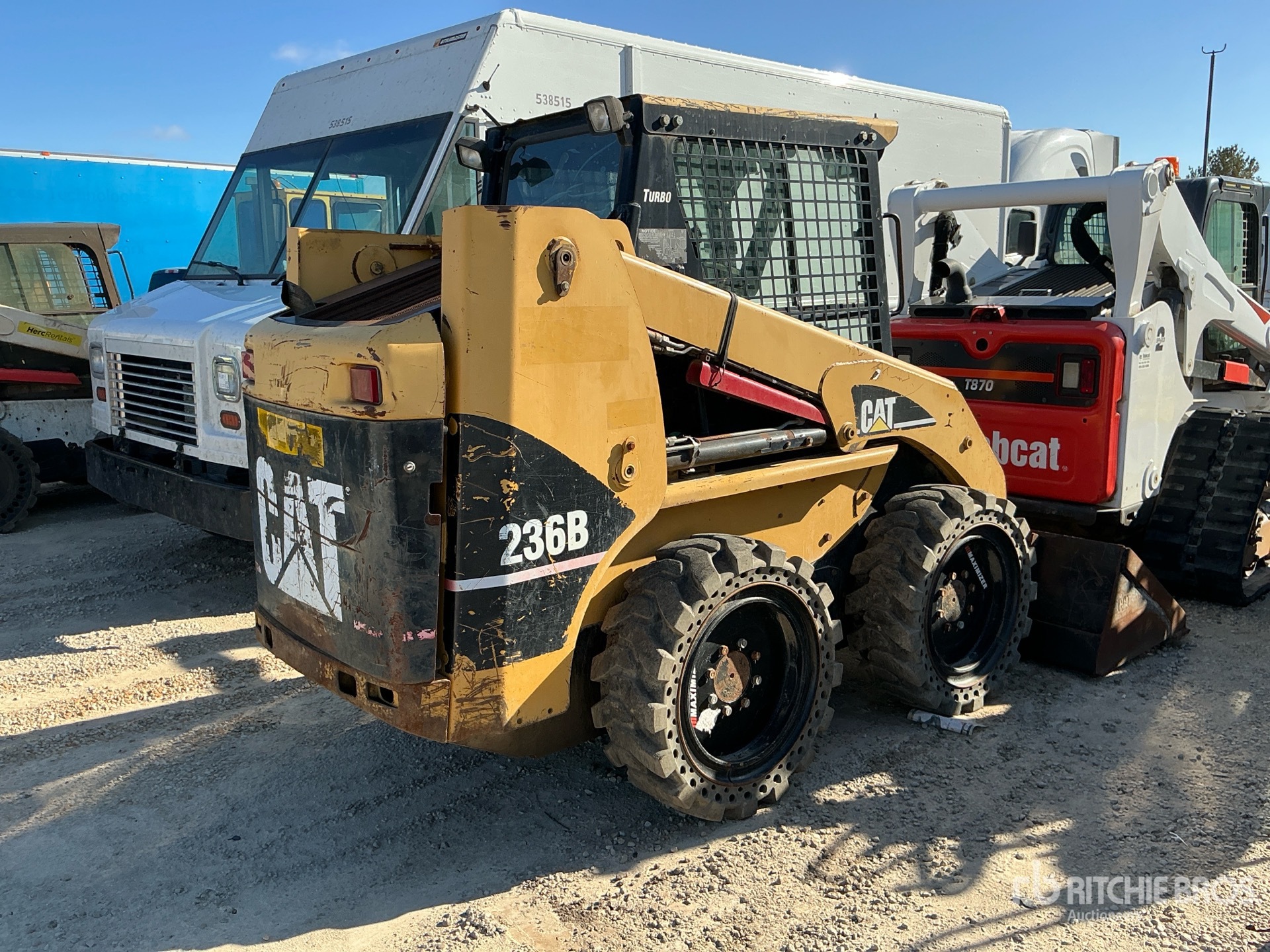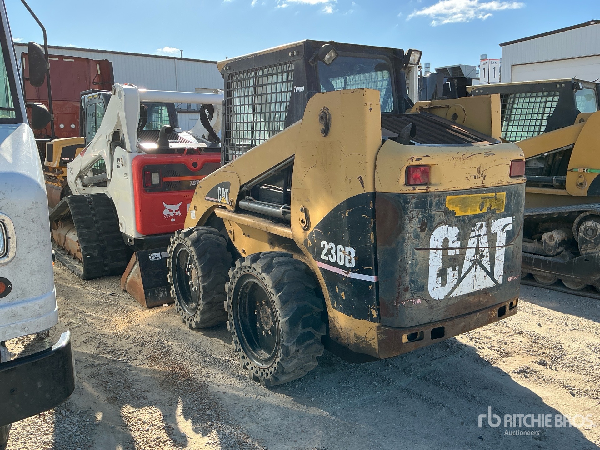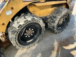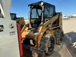 Enclosed Cab (Door missing), Joystick Steering, Aperture Tires, Hydraulic Coupler, 74 in Bucket