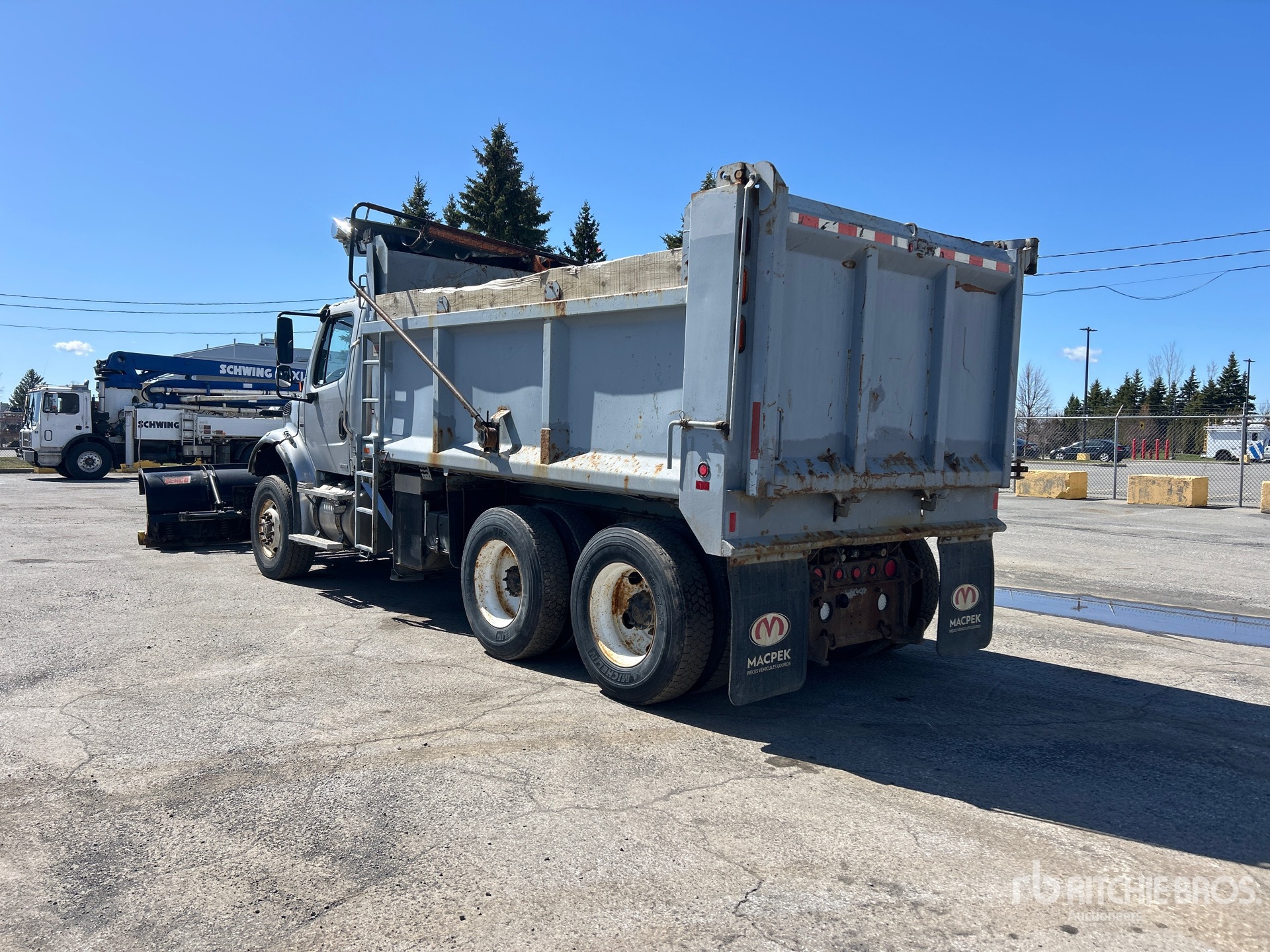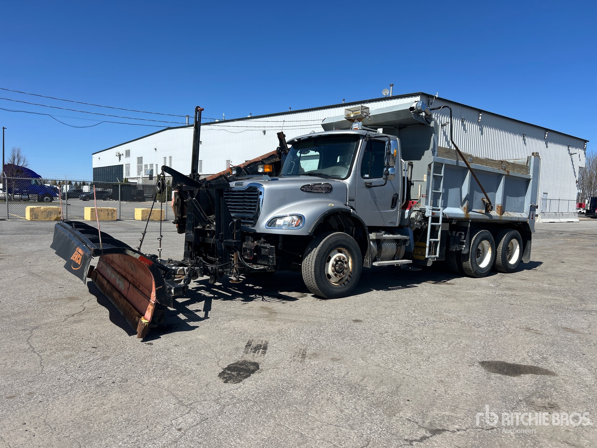 Mercedes Benz OM460 6 Cylinder 12.8 L Diesel 450 hp Engine, 2005 US EPA Label, Allison 4500 Automatic Transmission, 18180 lb Front Axle, 46000 lb Rears, 29112 kg GVWR, 315/80R22.5 Front Tires, 11R22.5 Rear Tires, Dual Steering Boxes, Double Frame, Air Assist Front Suspension, Air Ride Suspension, 192 in Wheelbase, PTO, Tenco 11 ft Hydraulic Reversing Plow, 11 ft Snow Wing, Ace Ecobite Steel Spreader, 1 Spinners, In-Cab Controls, 14 ft Long x 4 ft High Steel Body, 2-Way Dump, Electric Roll Tarp, 2-Way Tailgate