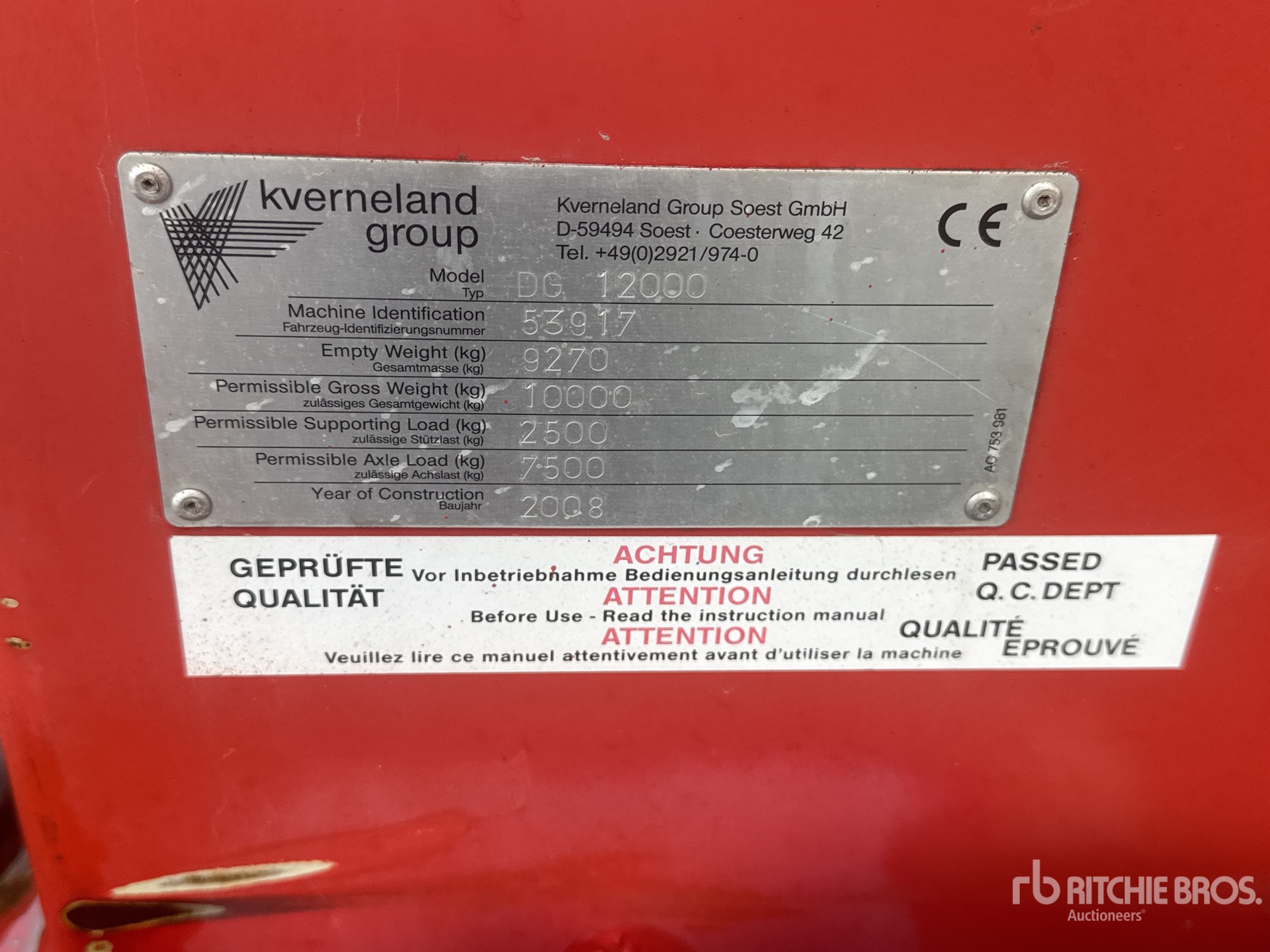 Szczegółowe informacje o sprzęcie mają ograniczony zakres, a firma Ritchie Bros. Auctioneers nie sprawdzała żadnych aspektów ani komponentów urządzenia innych niż wyraźnie określone w niniejszym dokumencie. O ile nie zostało to wyraźnie stwierdzone, nie składamy żadnych oświadczeń ani gwarancji, wyraźnych lub dorozumianych, dotyczących sprzętu lub jego komponentów, w tym między innymi oświadczeń lub gwarancji dotyczących funkcjonalności lub zgodności z jakąkolwiek normą bezpieczeństwa bądź wymogami jakiegokolwiek właściwego organu lub organu regulacyjnego, przydatności do określonego celu lub przydatności handlowej. Zdecydowanie zaleca się przeprowadzenie własnej szczegółowej inspekcji sprzętu przed złożeniem oferty.