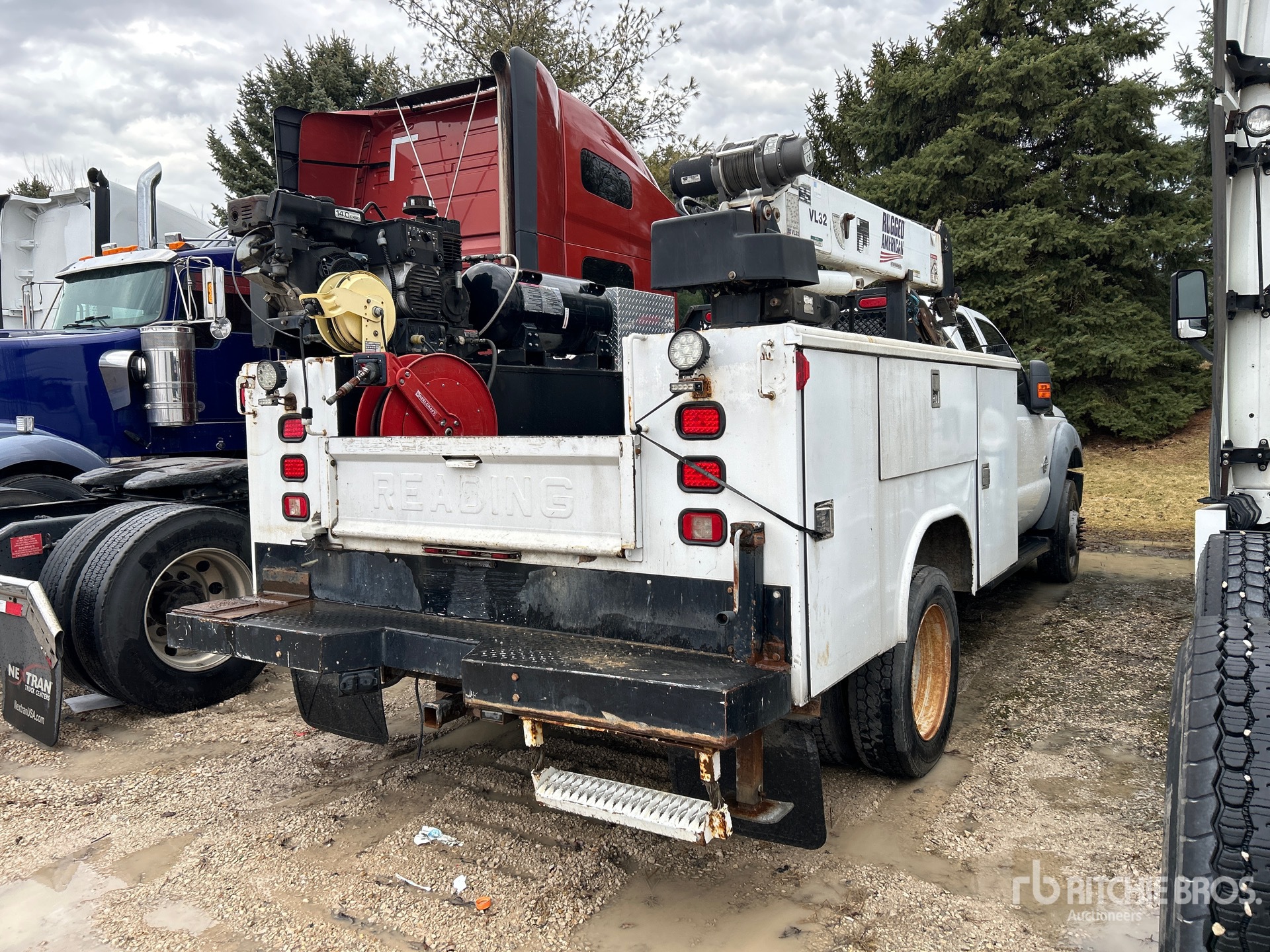 6.7 L Diesel Engine, 2011 US EPA Label, Engine Brake, Automatic Transmission, 6000 lb Front Axle, 12000 lb Rears, 16500 lb GVWR, Aluminum Wheels, 225/70R19.5, Spring Suspension, 164 in Wheelbase, Reading 9 ft Body, Rugged American 3200 lb Hydraulic Crane, Mi-T-M AGW-SR14-30M 4500 W Gasoline Generator Set, Mi-T-M AGW-SR14-30M Gasoline Air Compressor, Air Hose Reel, Mi-T-M AGW-SR14-30M 4500 W 170 A Gasoline 3-in-1 Welder