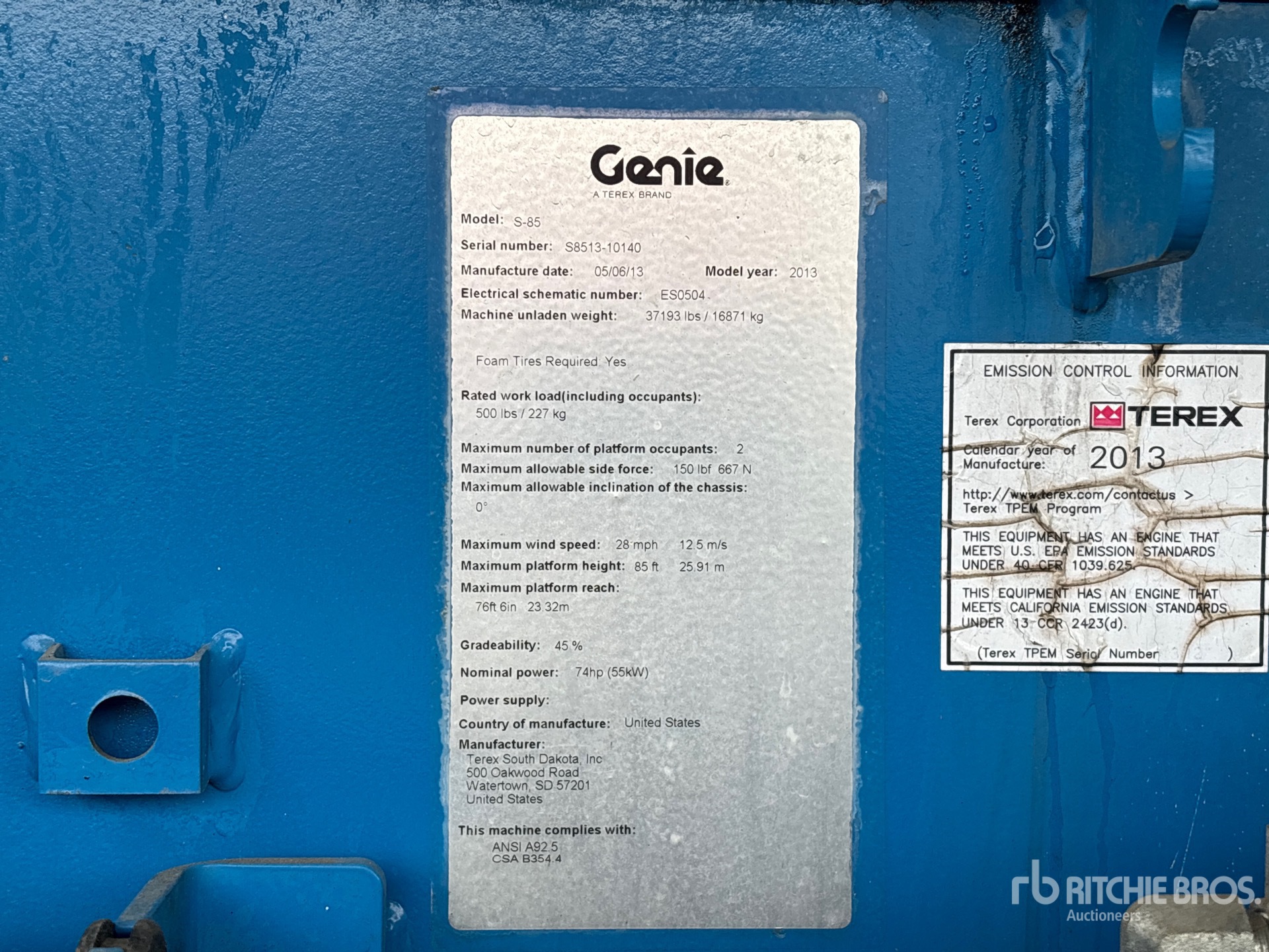 85 ft Max Platform Height, 500 lb Max Weight Capacity, Jib, Power to Platform, 2013 US EPA Label, CARB Compliant, Deutz D2011 L04 4 Cylinder 74 hp 3.019 L Diesel Engine, 18-625 NHS Tires