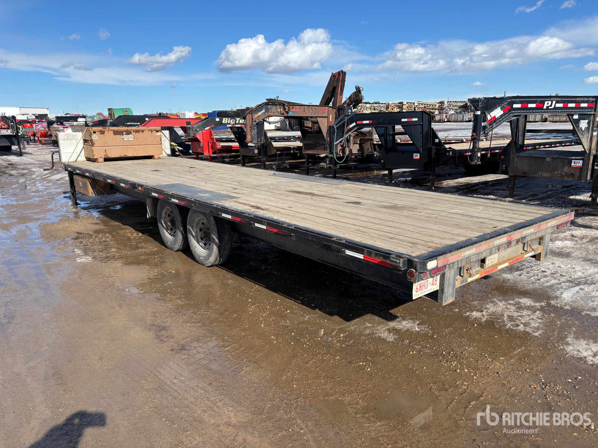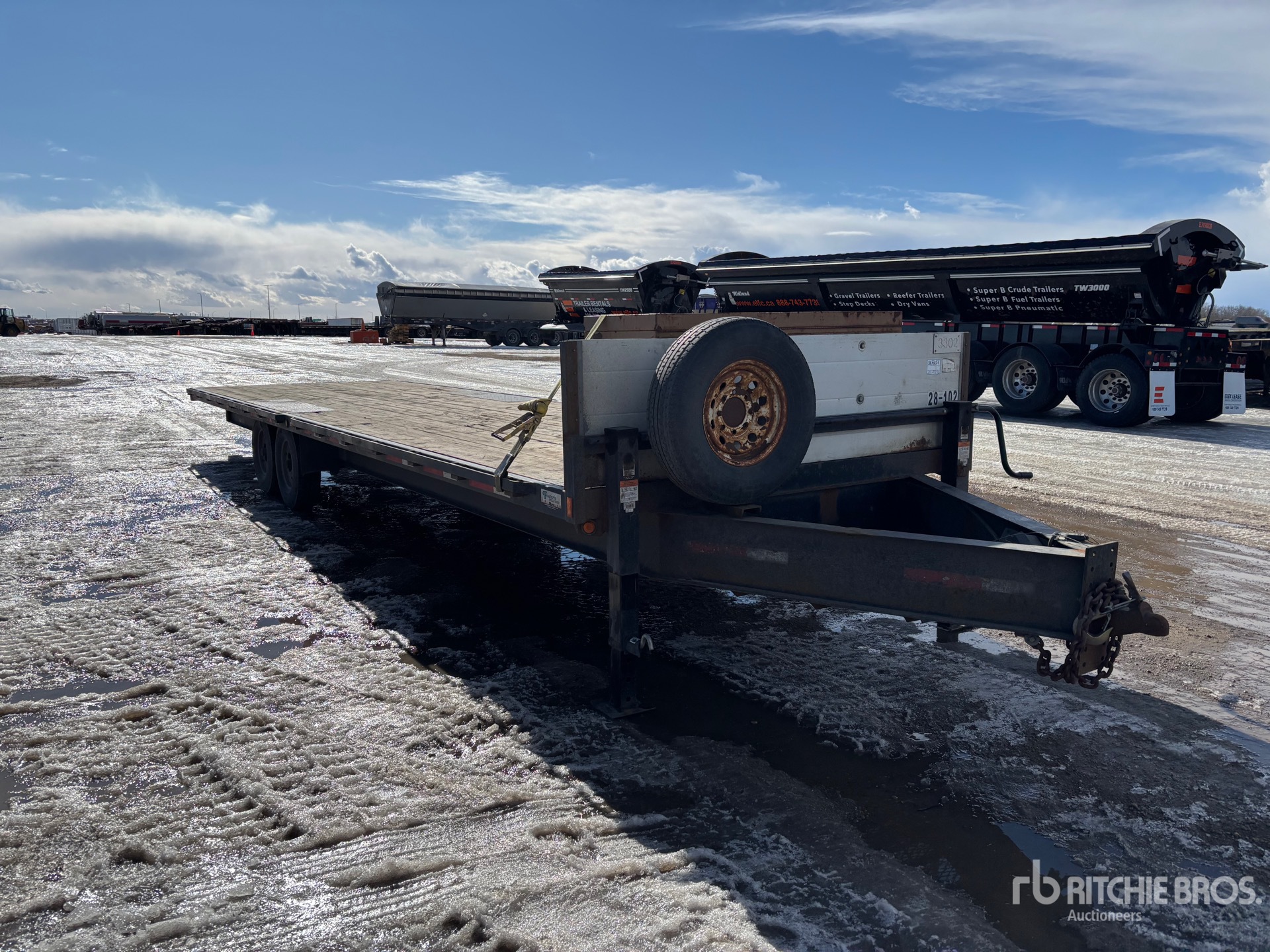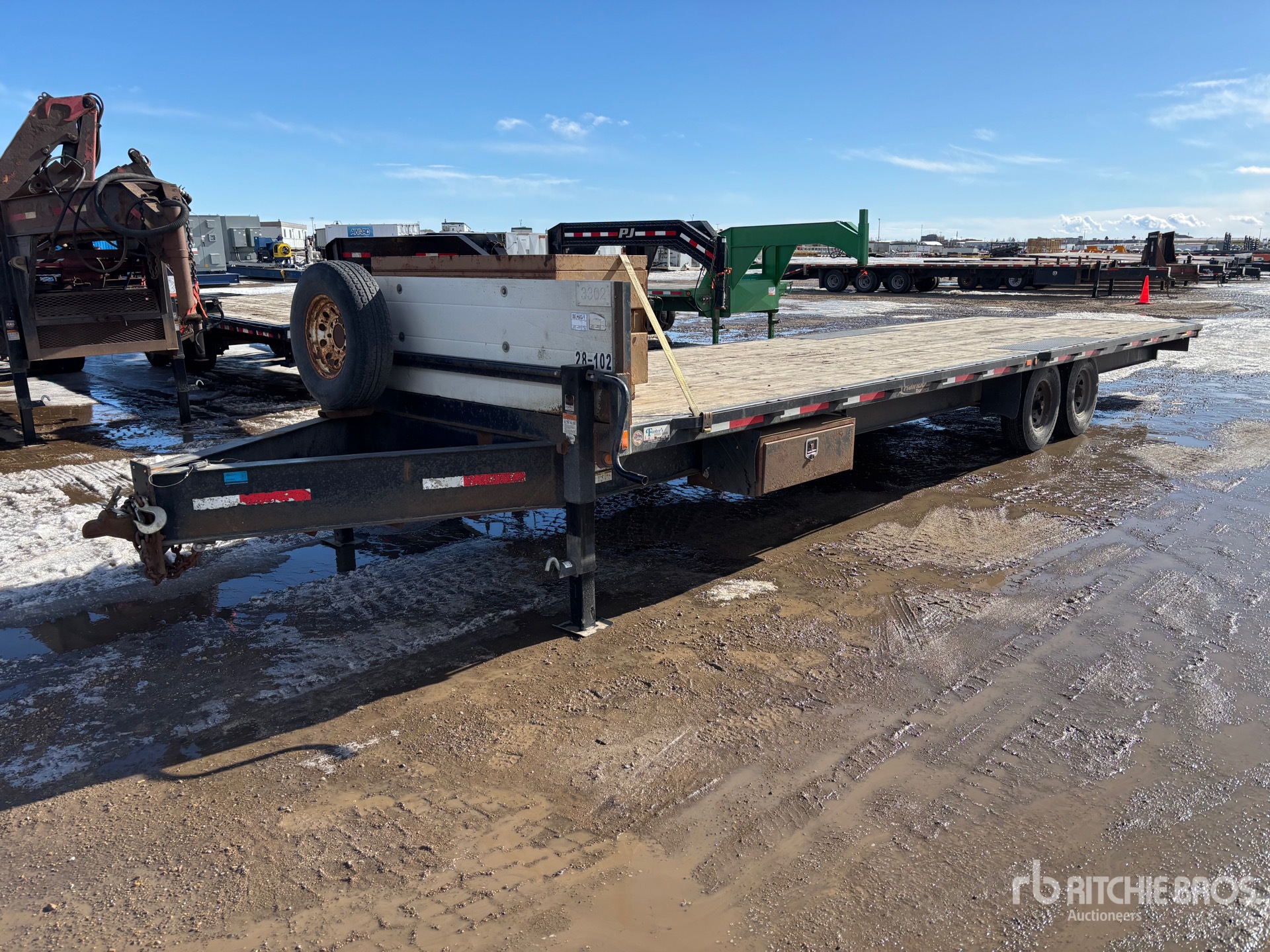 Ball Hitch, Torsion Axle, Electric Brakes, 30 ft Main Deck, 101 in Overall Deck Width, Storage Compartments, Deck Over Tires, Manual Ramps, Wood Flooring, 235/80R16 Tires, 14000 lb GVWR, C/W job site box