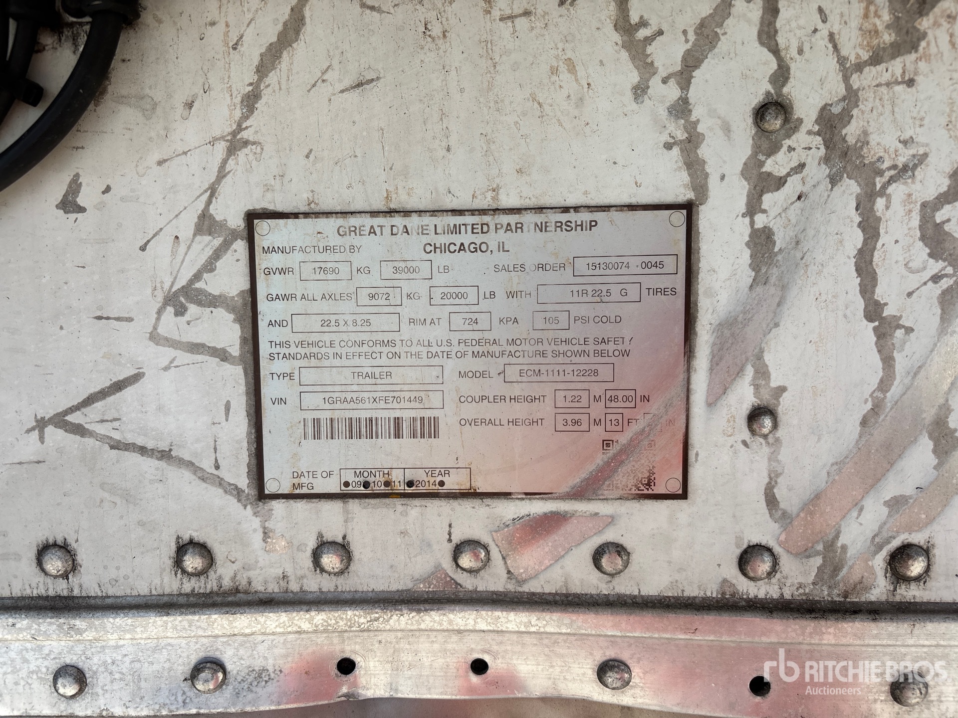 Szczegółowe informacje o sprzęcie mają ograniczony zakres, a firma Ritchie Bros. Auctioneers nie sprawdzała żadnych aspektów ani komponentów urządzenia innych niż wyraźnie określone w niniejszym dokumencie. O ile nie zostało to wyraźnie stwierdzone, nie składamy żadnych oświadczeń ani gwarancji, wyraźnych lub dorozumianych, dotyczących sprzętu lub jego komponentów, w tym między innymi oświadczeń lub gwarancji dotyczących funkcjonalności lub zgodności z jakąkolwiek normą bezpieczeństwa bądź wymogami jakiegokolwiek właściwego organu lub organu regulacyjnego, przydatności do określonego celu lub przydatności handlowej. Zdecydowanie zaleca się przeprowadzenie własnej szczegółowej inspekcji sprzętu przed złożeniem oferty.