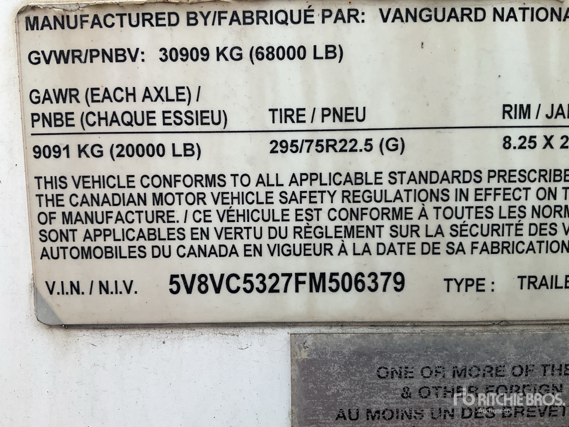 Air Ride Sliding Suspension, Hardwood Floor, Swing Door, 295/75R22.5 Tires 68000 lb GVWR