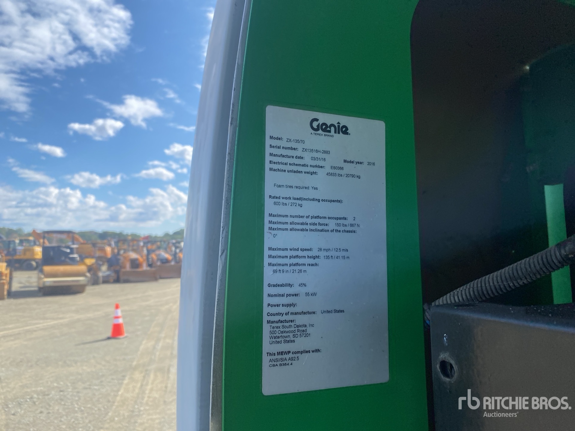 135 ft Max Platform Height, 600 lb Max Weight Capacity, Jib, Extendable Axles, Power to Platform, 2015 US EPA Label, Deutz TD 2.9 L4 4 Cylinder 74 hp 2.9 L Diesel Engine, 445/50D710 Tires