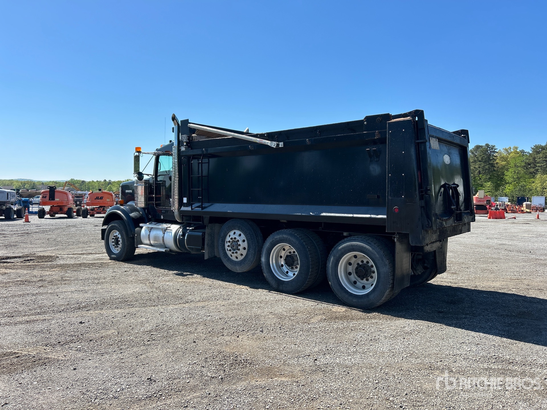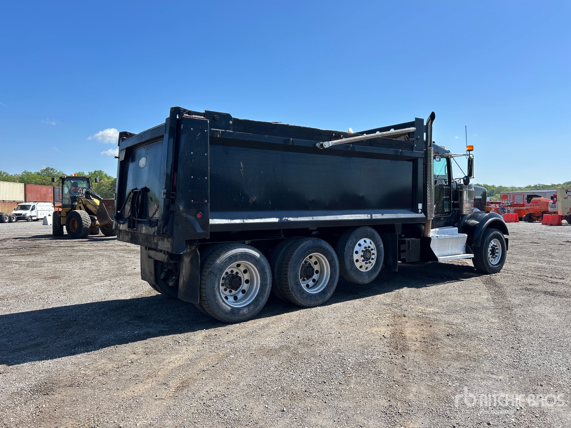 Paccar MX-13 6 Cylinder Diesel Engine, US EPA Label, 15687 Engine hrs, Manual Transmission, 20000 lb Front Axle, 59220 lb Rears, 79220 lb GVWR, Aluminum Wheels, 315/80R22.5 Front Tires, 11R24.5 Rear Tires, Steerable Air Lift Pusher Axle, Air Ride Suspension, 242 in Wheelbase, Heritage 17 ft Long x 4 ft 6 in High Steel Body, Electric Roll Tarp, Tailgate Chute