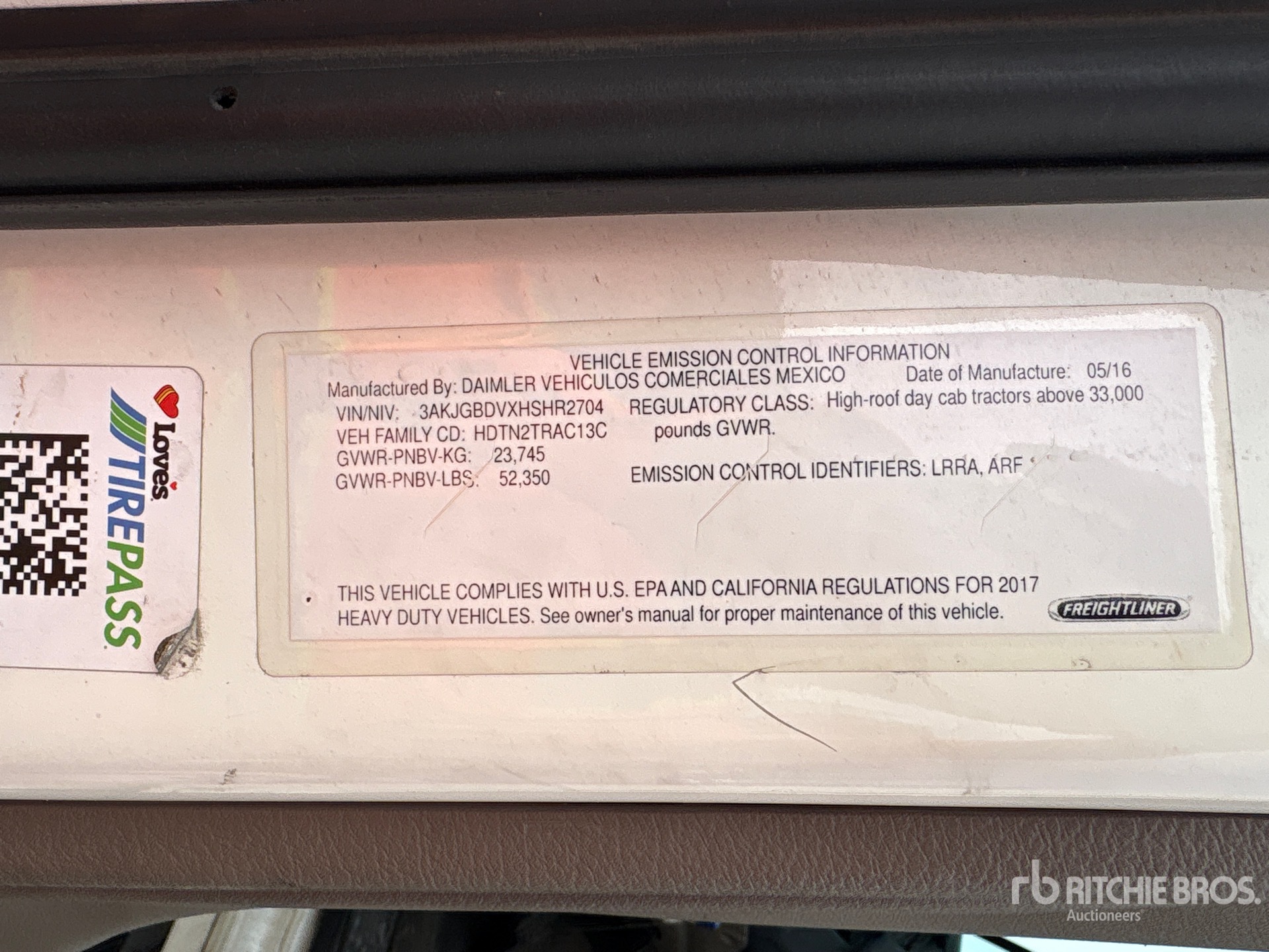 Detroit DD13 Engine, 2017 US EPA Label, Eaton Fuller FRO-15210B 10-Speed Manual Transmission 12350 lb Front Axle, 40000 lb Rears, 52350 lb GVWR, 160 in Wheelbase, Air Suspension, Aluminum Wheels, 295/75R22.5 Front Tires, 295/75R22.5 Rear Tires