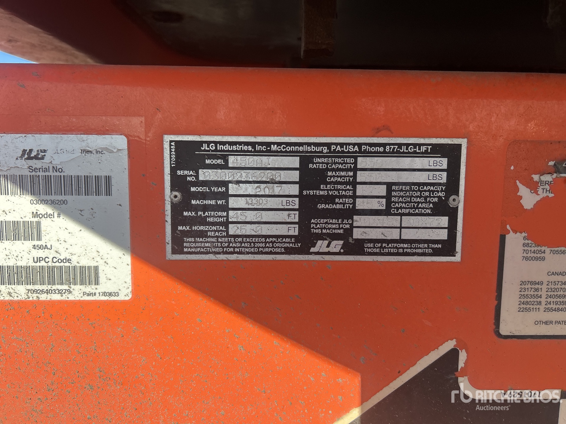 45 ft Max Platform Height, 550 lb Max Weight Capacity, Jib, Power to Platform, 2017 US EPA Label, Deutz 4 Cylinder 2.9 L Diesel Engine, 12-16.5NHS Foam-Filled Tires