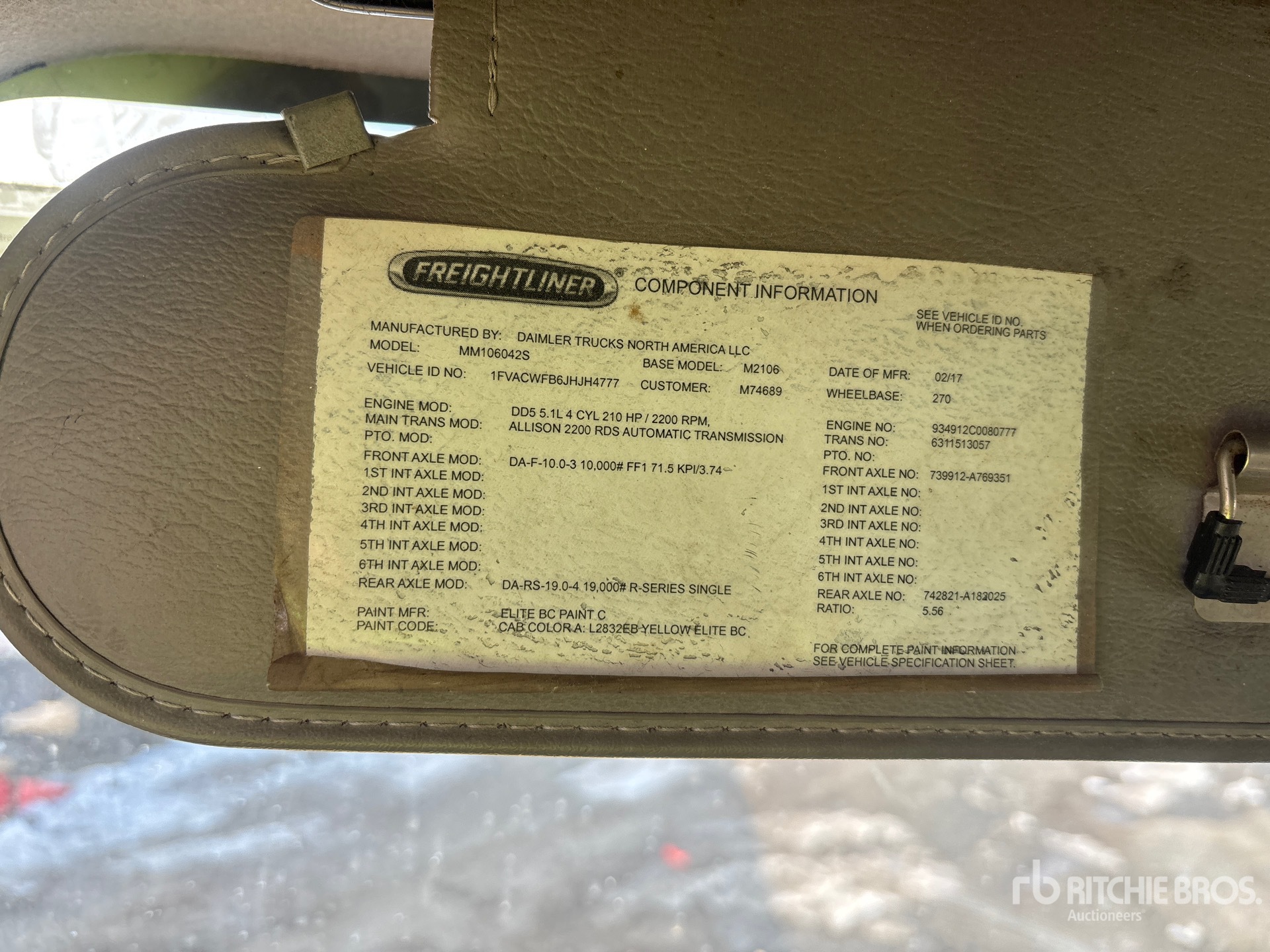 Detroit DD5 4 Cylinder 5.1 L Diesel 210 hp Engine, 2017 US EPA Label, Requires Diesel Exhaust Fluid, 10391 Engine hrs, Allison 2200 Automatic Transmission, 10000 lb Front Axle, 19000 lb Rears, 5.56:1 Axle Ratio, 26000 lb GVWR, 11R22.5, Air Ride Suspension, 270 in Wheelbase, Morgan 26 ft x 102 in Wide x 103 in High Body, Liftgate