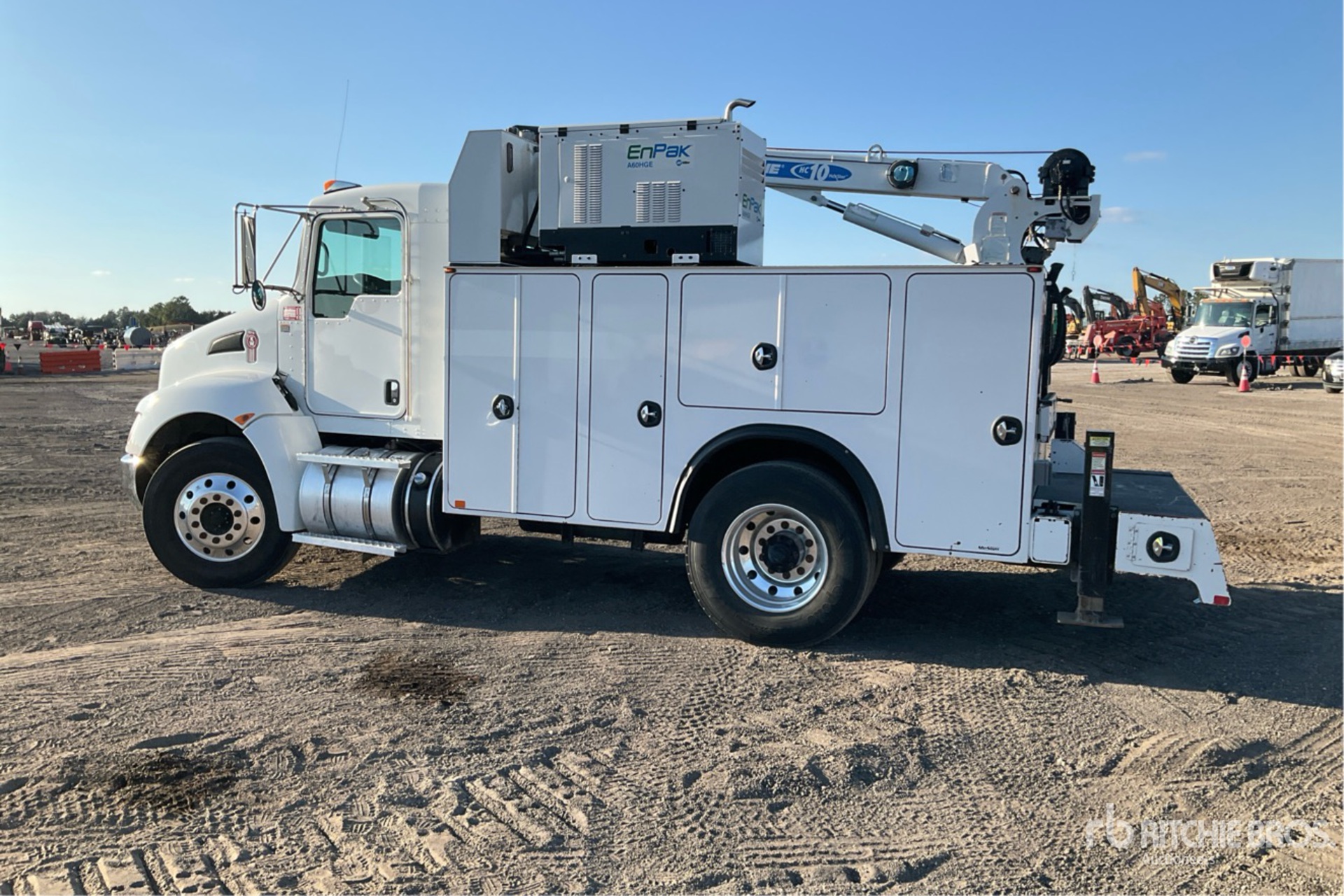 Paccar PX-7 6 Cylinder 6.7 L Diesel 300 hp Engine, 2017 US EPA Label, Requires Diesel Exhaust Fluid, 6802 Engine hrs, Engine Brake, Allison 3500 6-Speed Automated Transmission, 10000 lb Front Axle, 16000 lb Rears, Dana P22060S Drive Axles, 5.29:1 Axle Ratio, 26000 lb GVWR, Aluminum Outer Wheels, 11R22.5, Spring Suspension, 158 in Wheelbase, Auto Crane Titan 60K Body 14 ft Body, Manual Stabilizers, Auto Crane 10000 lb 3 Section Hydraulic Crane, Wired Remote Control, Miller EnPak A60HGE Generator Set, 60 cfm Hydraulic Air Compressor, Air Hose Reel