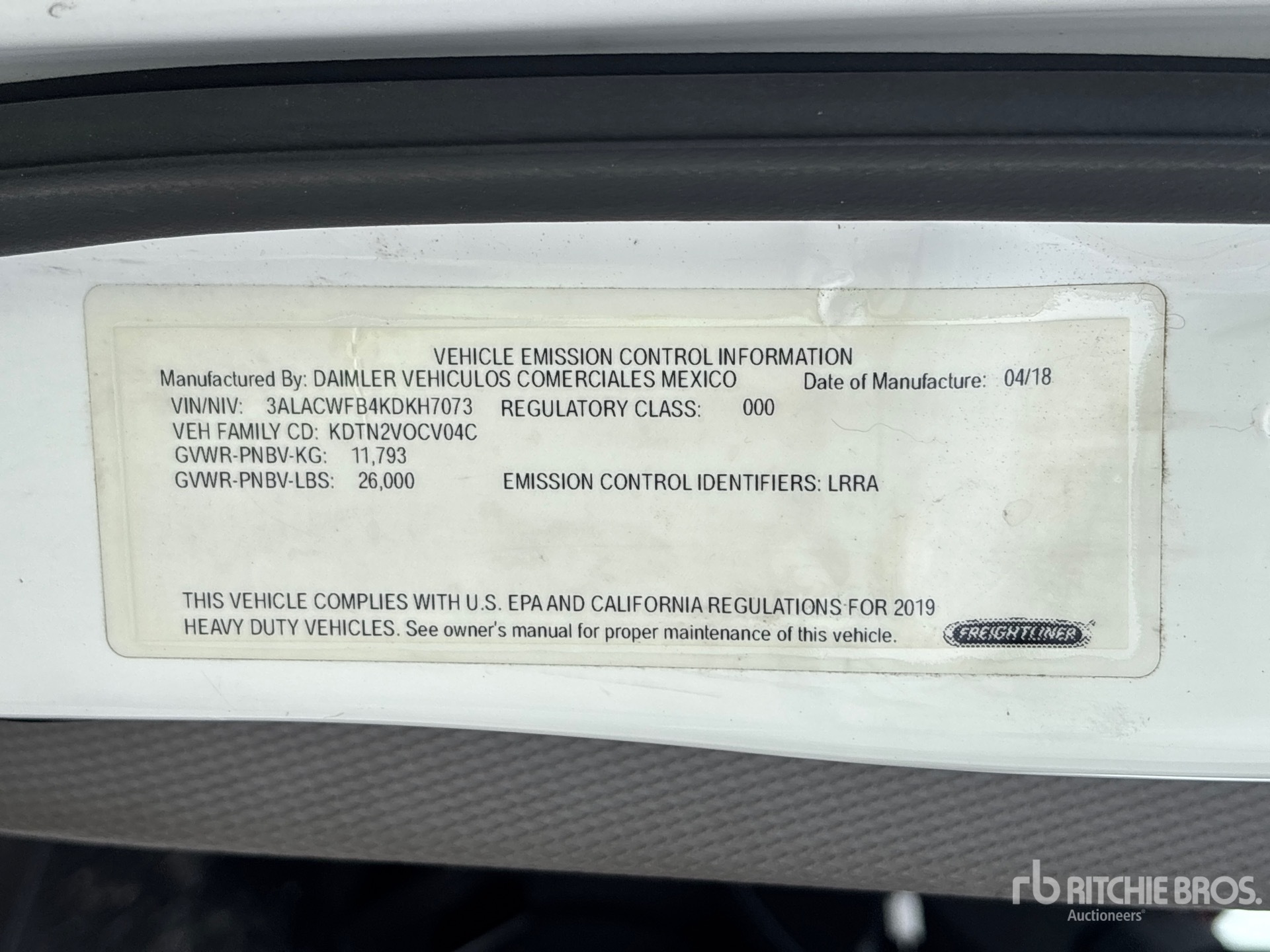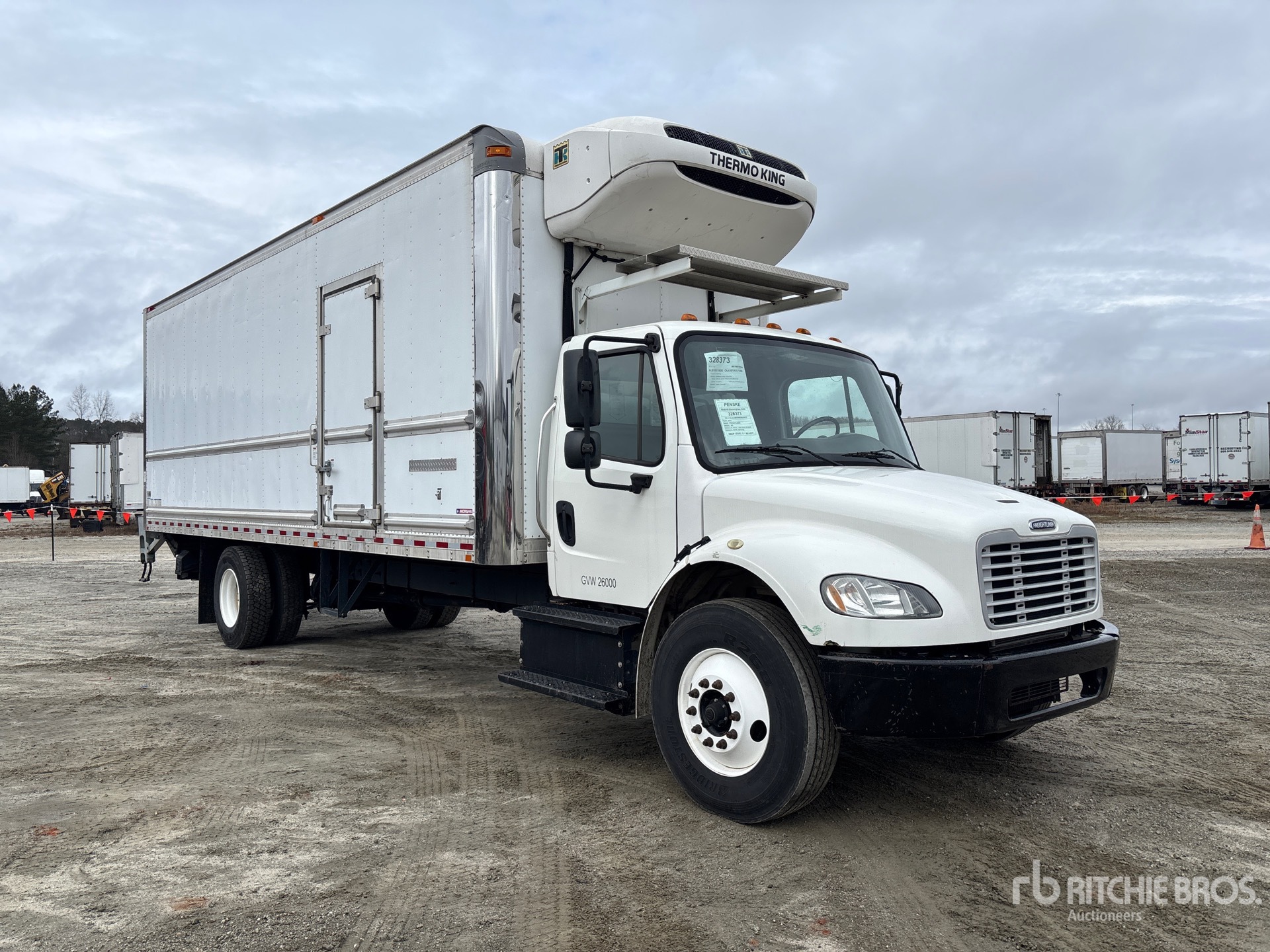 Detroit DD5 4 Cylinder 5.1 L Diesel 230 hp Engine, 2018 US EPA Label, Requires Diesel Exhaust Fluid, 6121.2 Engine hrs, Allison 2200 Automatic Transmission, 10000 lb Front Axle, 19000 lb Rears, Meritor MS-19-14X Drive Axles, 5.86:1 Axle Ratio, 26000 lb GVWR, 11R22.5, Airliner Air Ride Suspension, 270 in Wheelbase, Thermo King T-880S Reefer Unit, Standby Power, Morgan 26 ft x 102 in Wide x 103 in High Body, Curbside Door, Liftgate