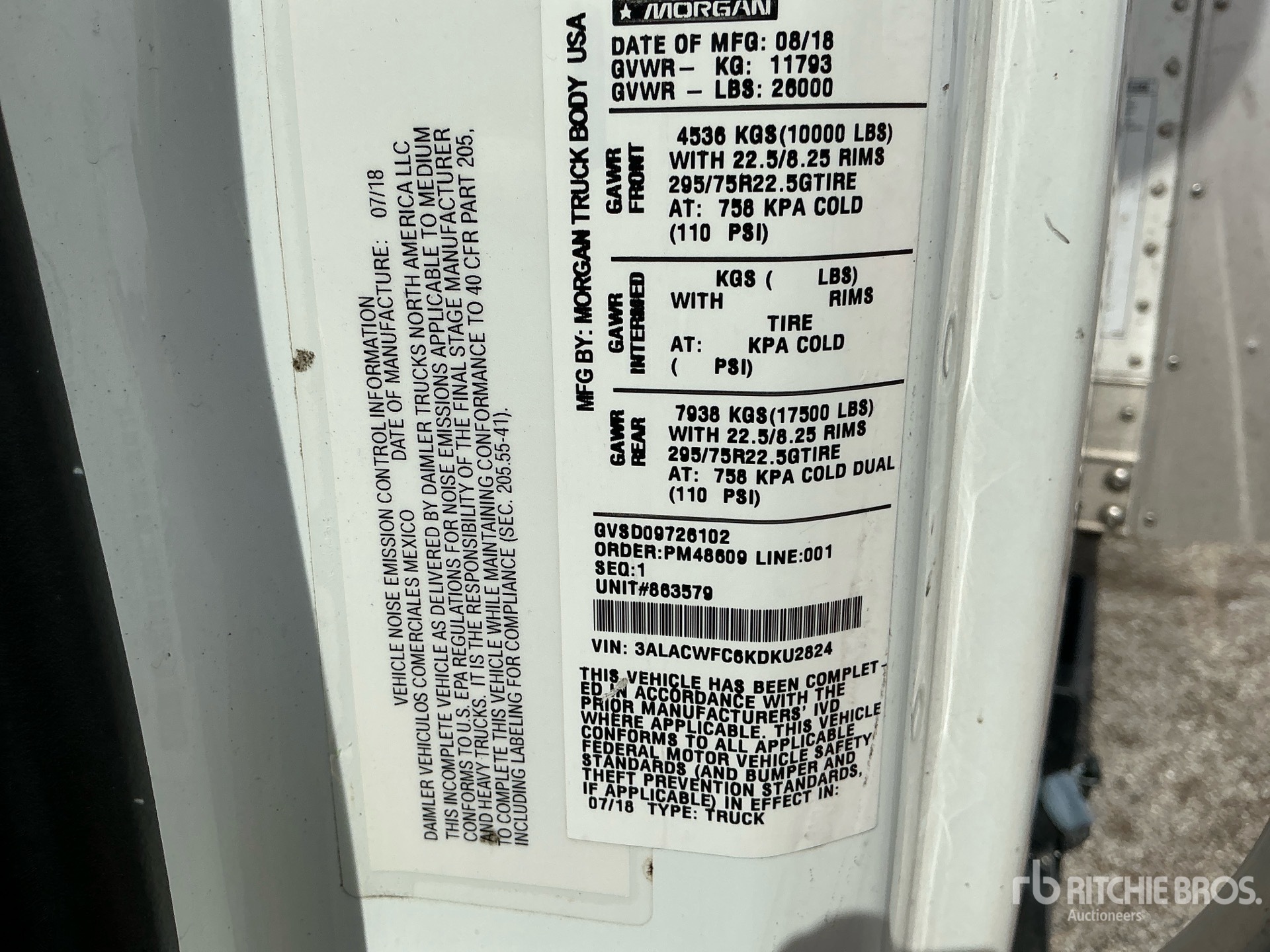 Cummins ISB 6 Cylinder Diesel Engine, US EPA Label, 9836 Engine hrs, Automatic Transmission, 10000 lb Front Axle, 17500 lb Rears, 26000 lb GVWR, Air Ride Cab, 295/75R22.5 Front Tires, 295/75R22.5 Rear Tires, Air Ride Suspension, 282 in Wheelbase, Morgan 26 ft x 102 in Wide x 96 in High Body, Liftgate