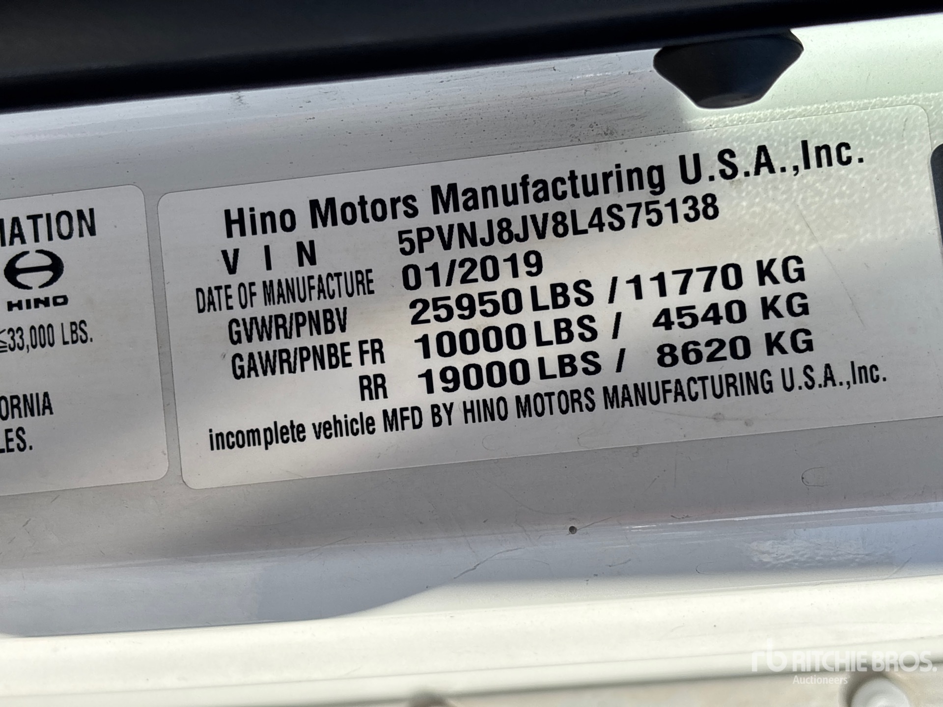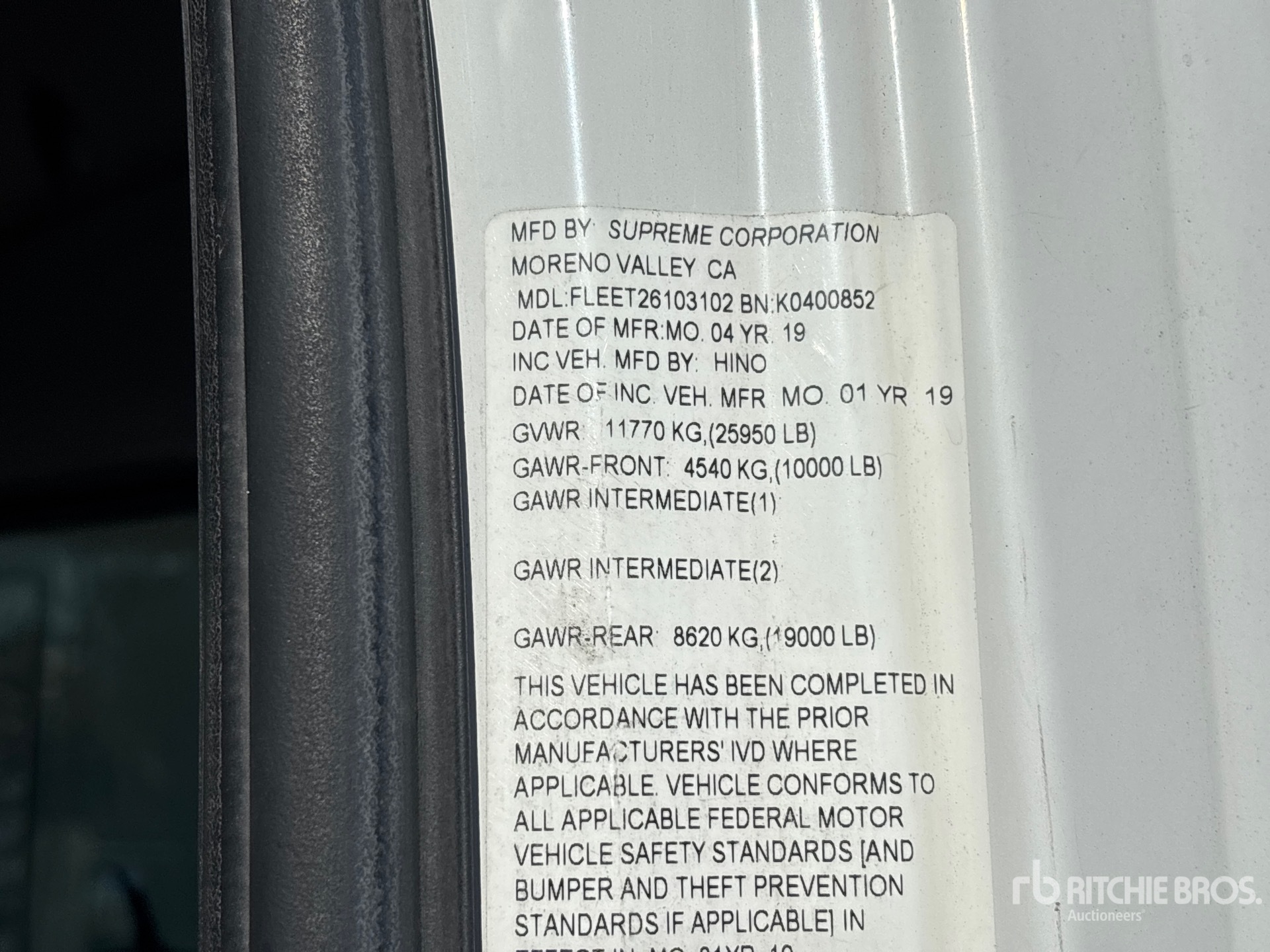Hino J08E-WU 6 Cylinder 469 cid Diesel 230 hp Engine, 2018 US EPA Label, Requires Diesel Exhaust Fluid, 7288 Engine hrs, Automatic Transmission, 10000 lb Front Axle, 19000 lb Rears, 25950 lb GVWR, 11R22.5 Front Tires, 11R22.5 Rear Tires, Air Ride Suspension, 271 in Wheelbase, Supreme 26 ft x 102 in Wide x 103 in High Body, Liftgate, Professionally-Maintained-Fleet-Vehicle-PAG