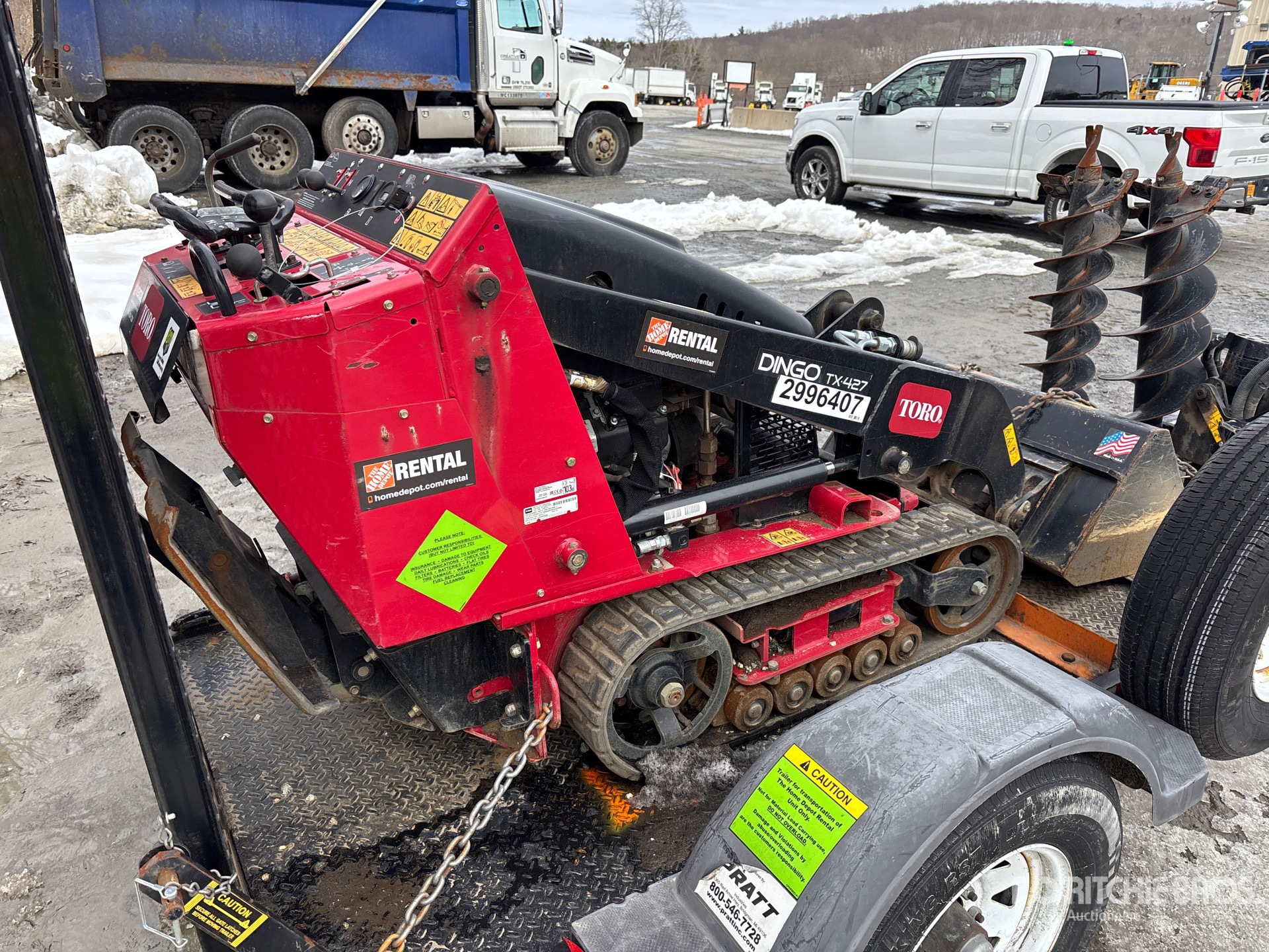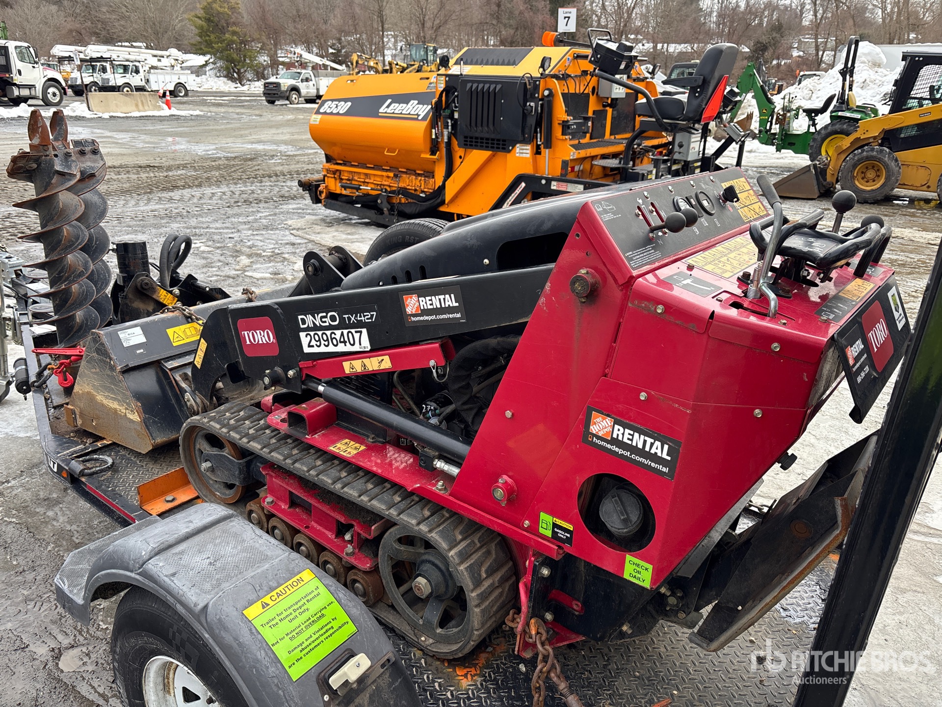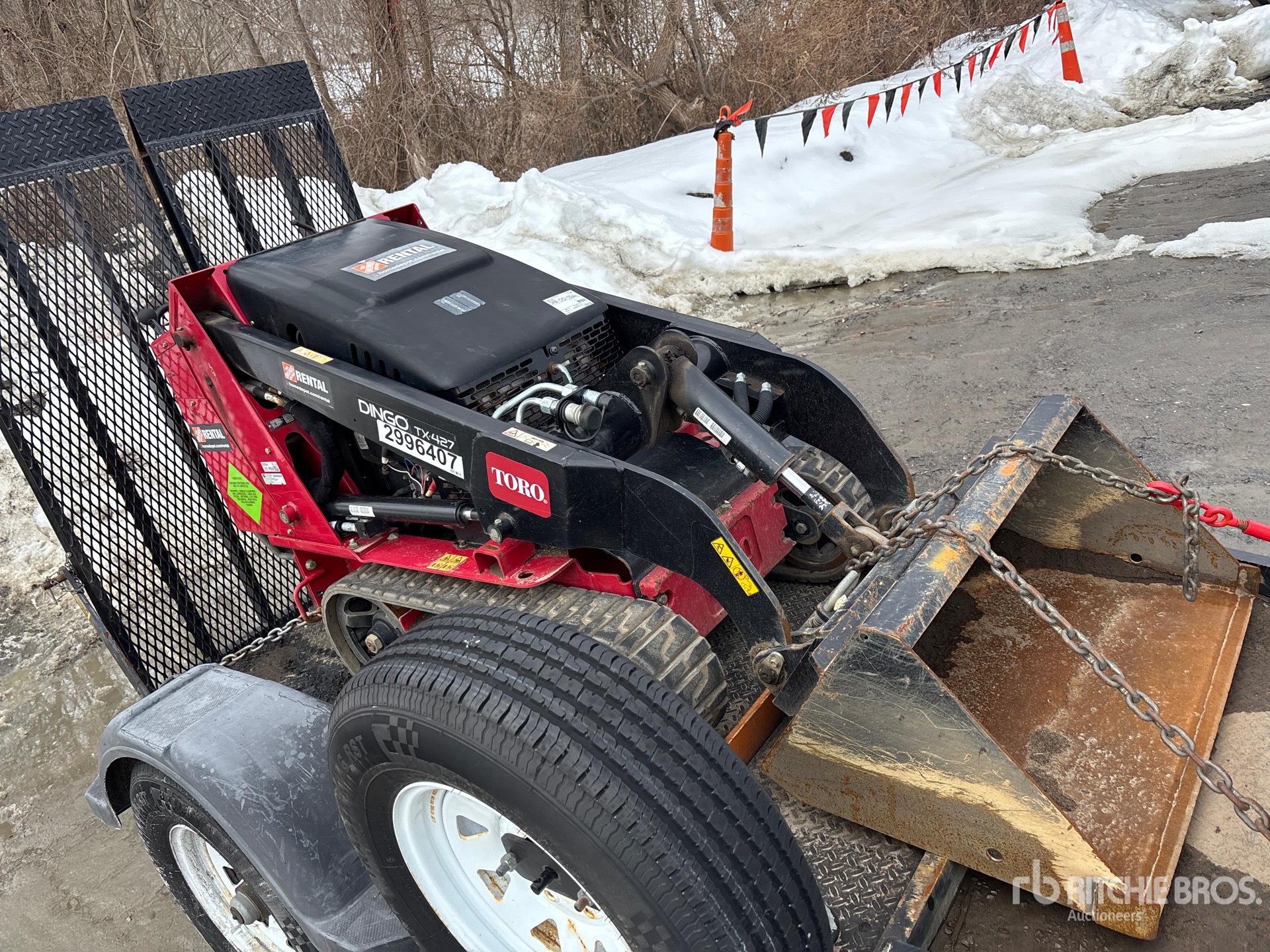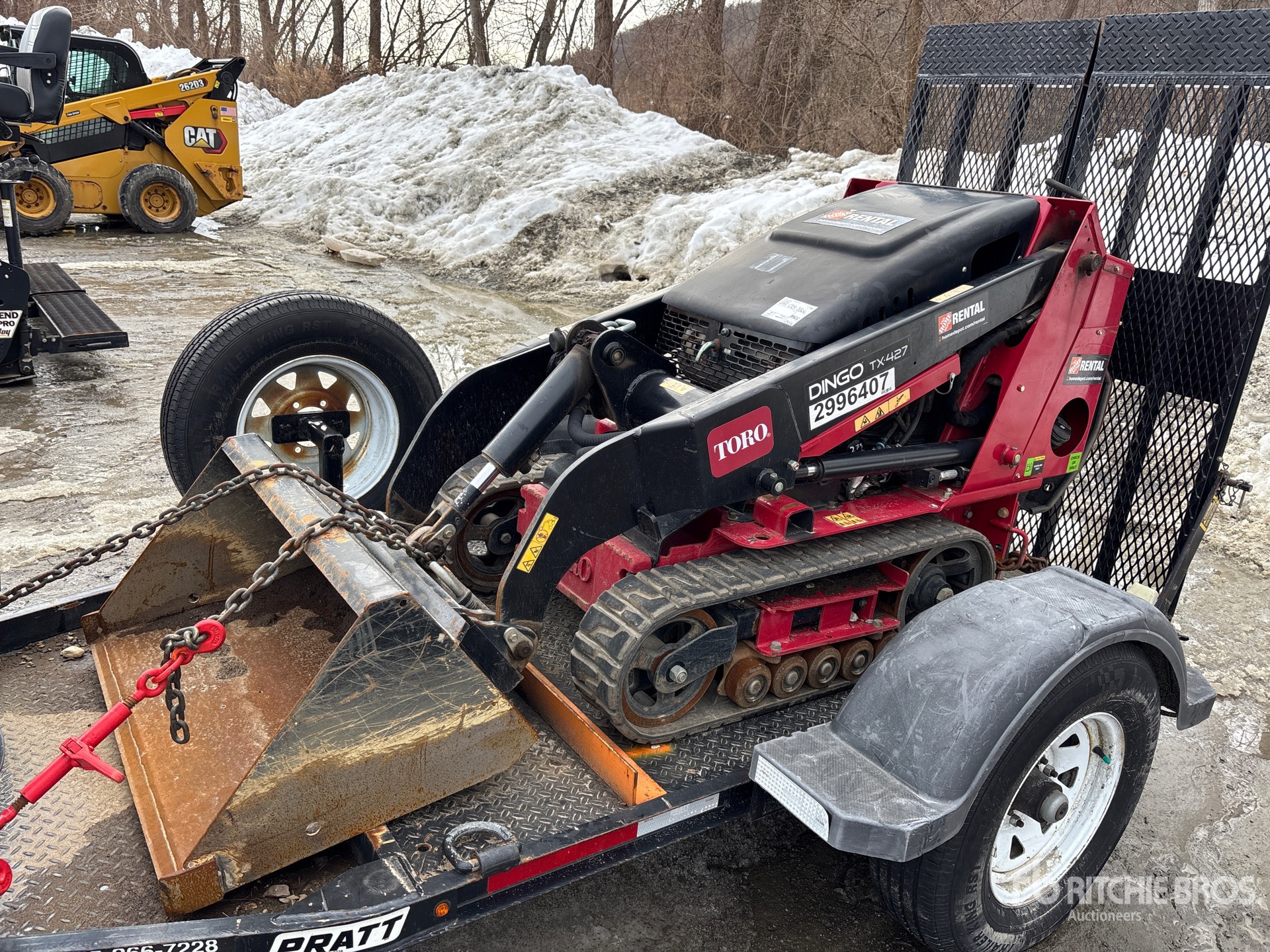 Open Operator Station, Joystick Steering, 2025 US EPA Label, CARB Compliant, 6 in Track Belts, Manual Coupler, 34 in Bucket, Ball Hitch Carrier Trailer, Surge Brakes
