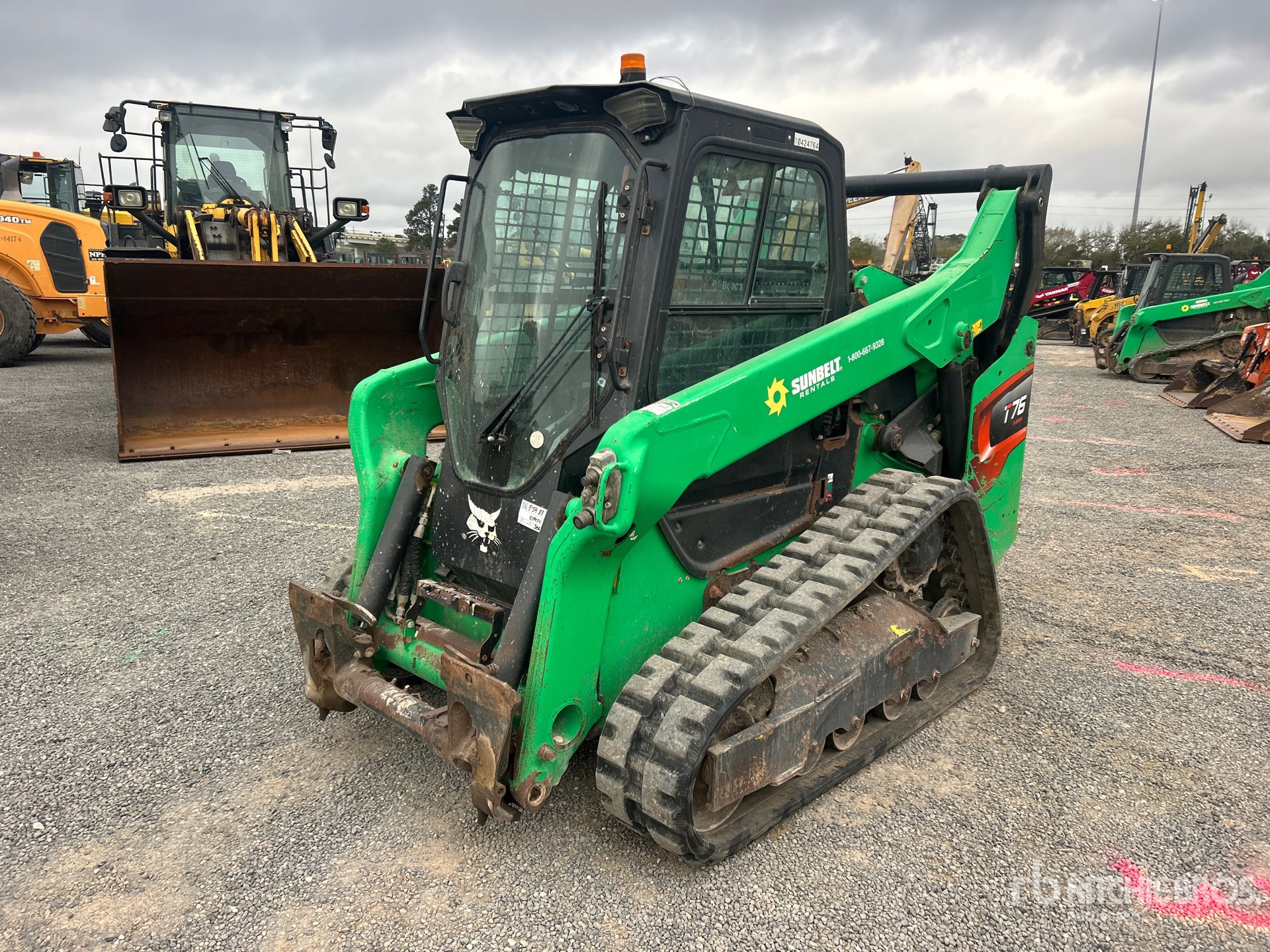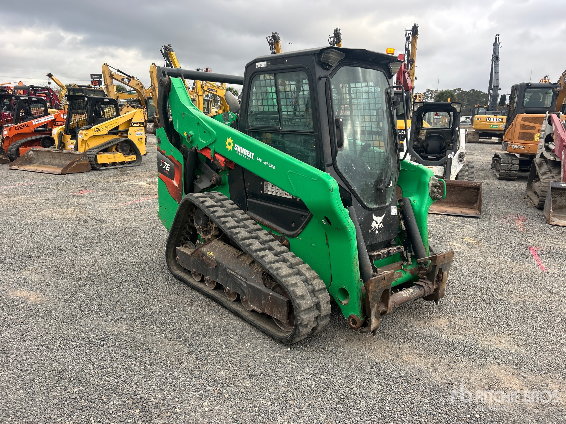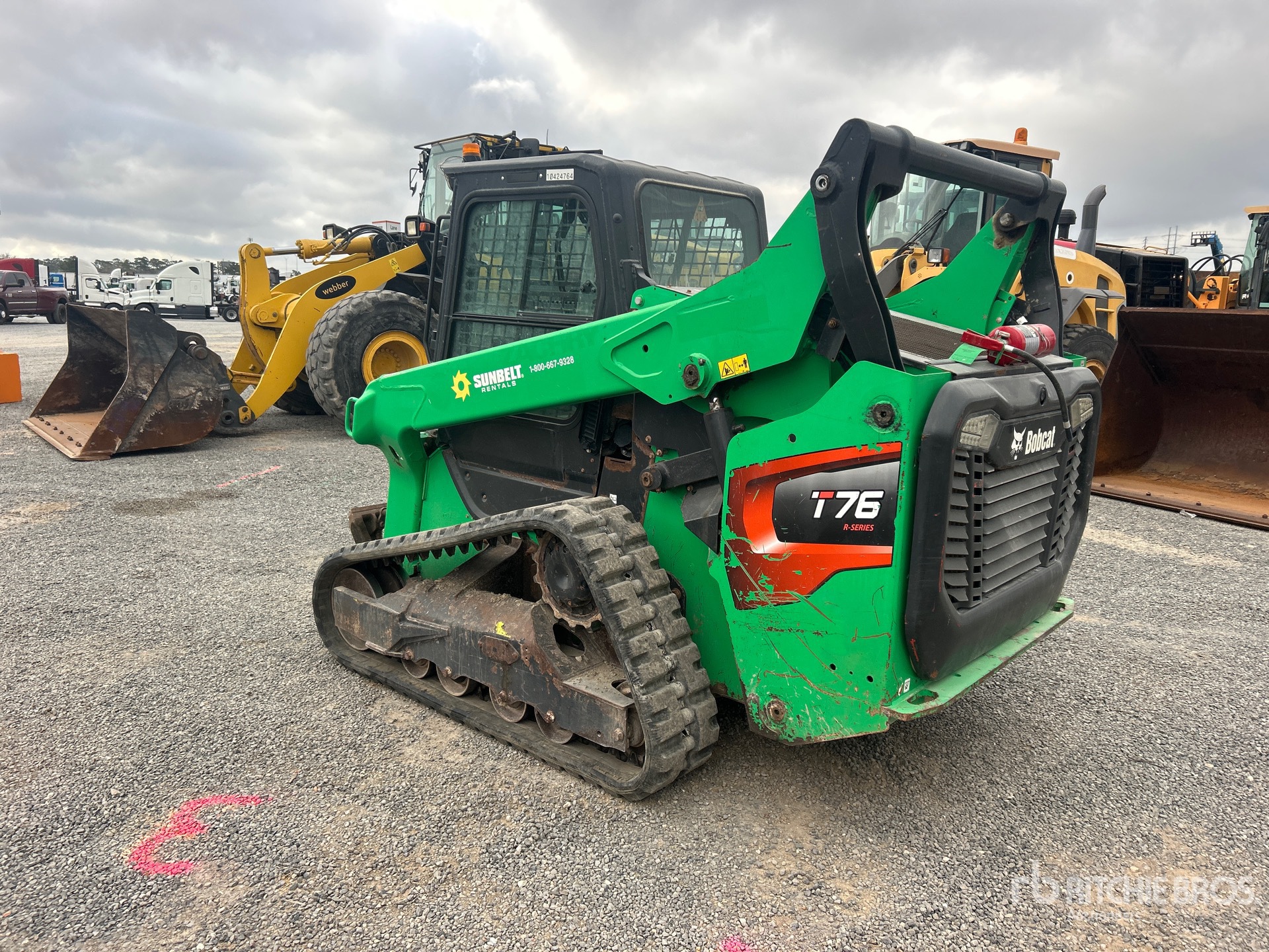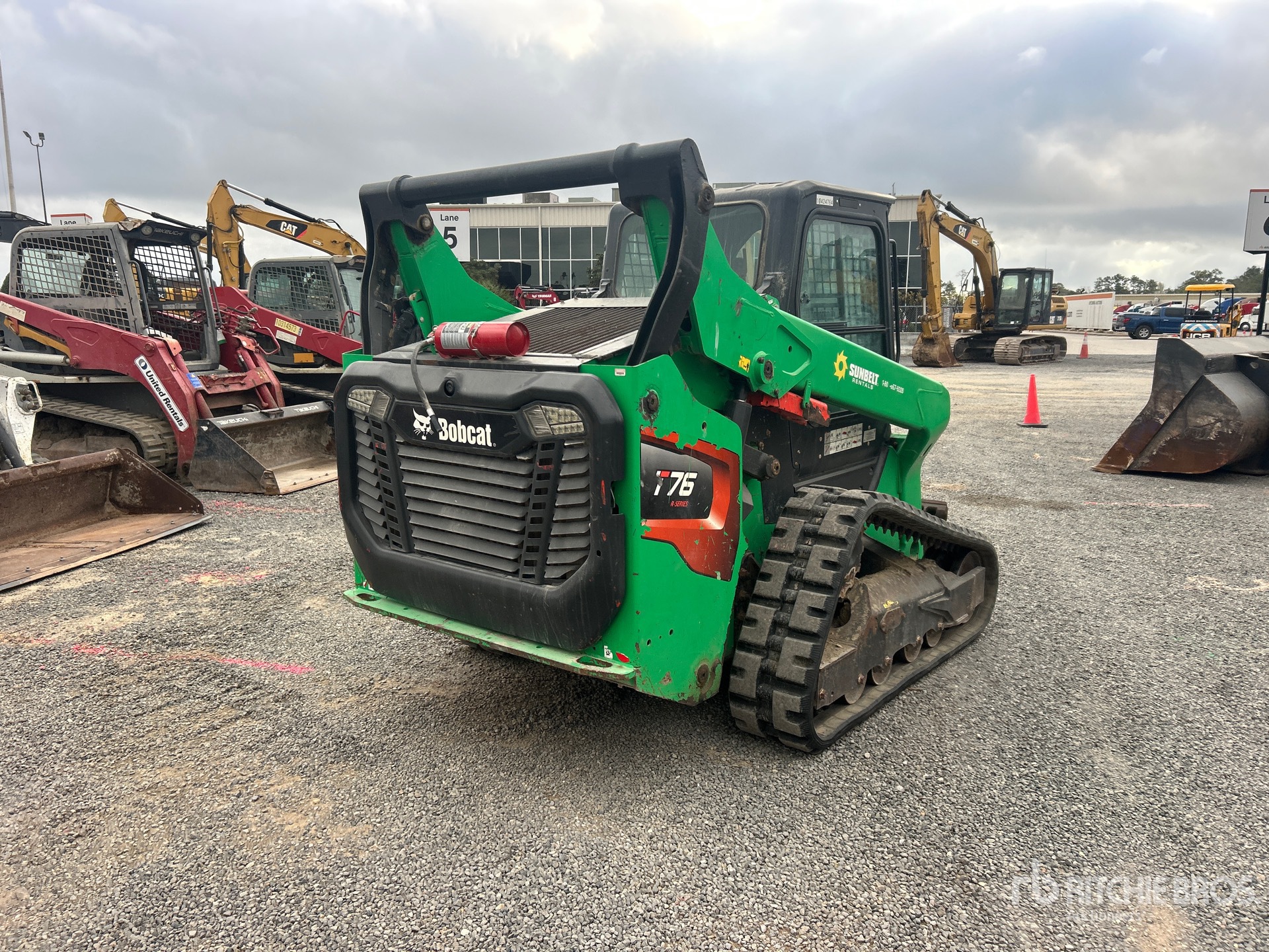 Located in Lane 5 Spot 5, Enclosed Cab, Air Conditioner, Ride Control, Joystick Steering, Rear View Camera, 12.5 in Track Belts, 7 Pin Electric Kit, Manual Coupler, Equipment-from-Sunbelt-Rentals