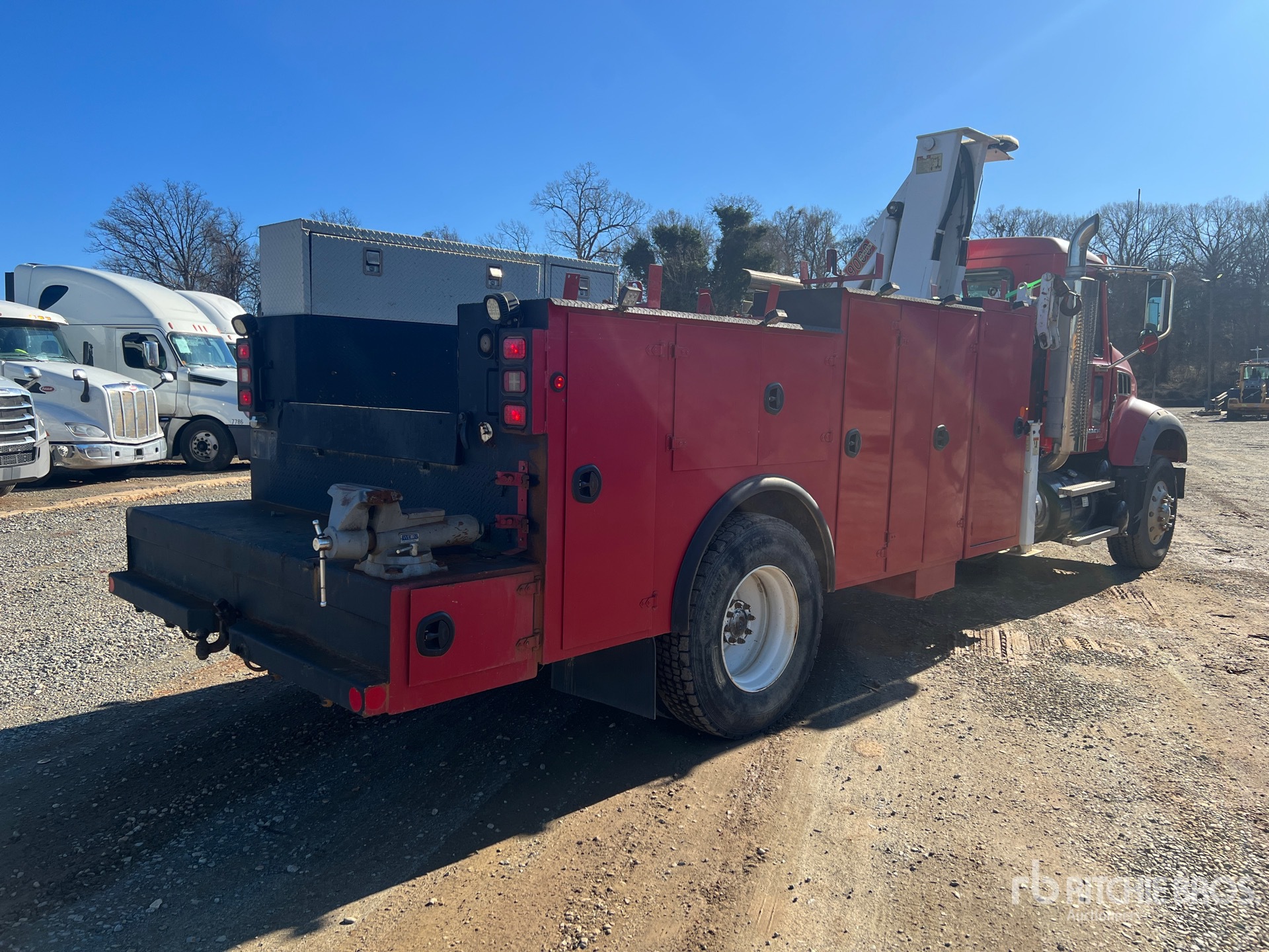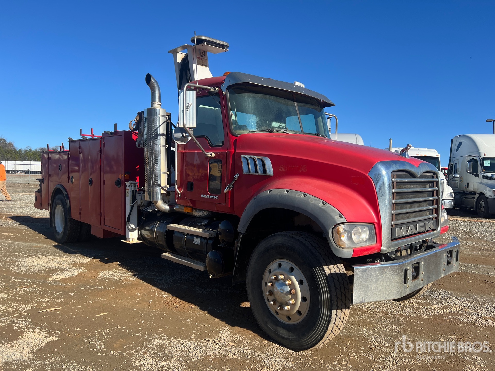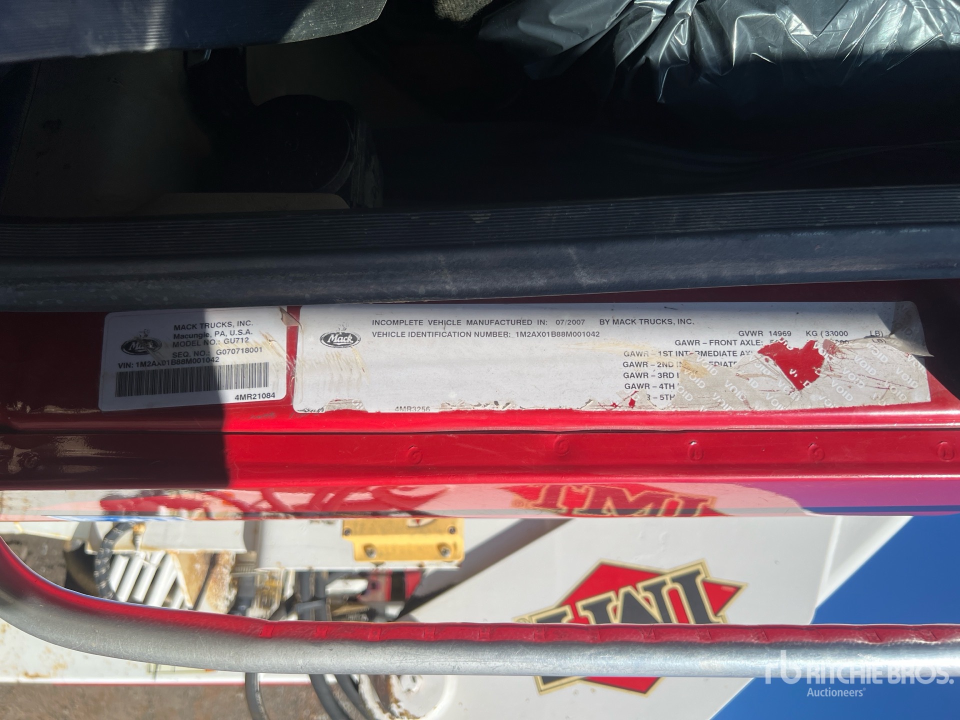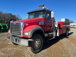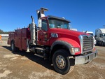 Mack MP7 6 Cylinder 10.8 cid Diesel 300 hp Engine, 2007 US EPA Label, CARB Compliant, 23417 Engine hrs, Engine Brake, 8-Speed Manual Transmission, 463:1 Axle Ratio, 33000 lb GVWR, Aluminum Front Wheels, 315/80R22.5 Front Tires, 11R22.5 Rear Tires, Spring Suspension, 231 in Wheelbase, PTO, 13 ft 0 in Body, Hydraulic Stabilizers, TMT 9000 11300 lb 3 Section Hydraulic Crane, Wireless Remote Control, Air Hose Reel