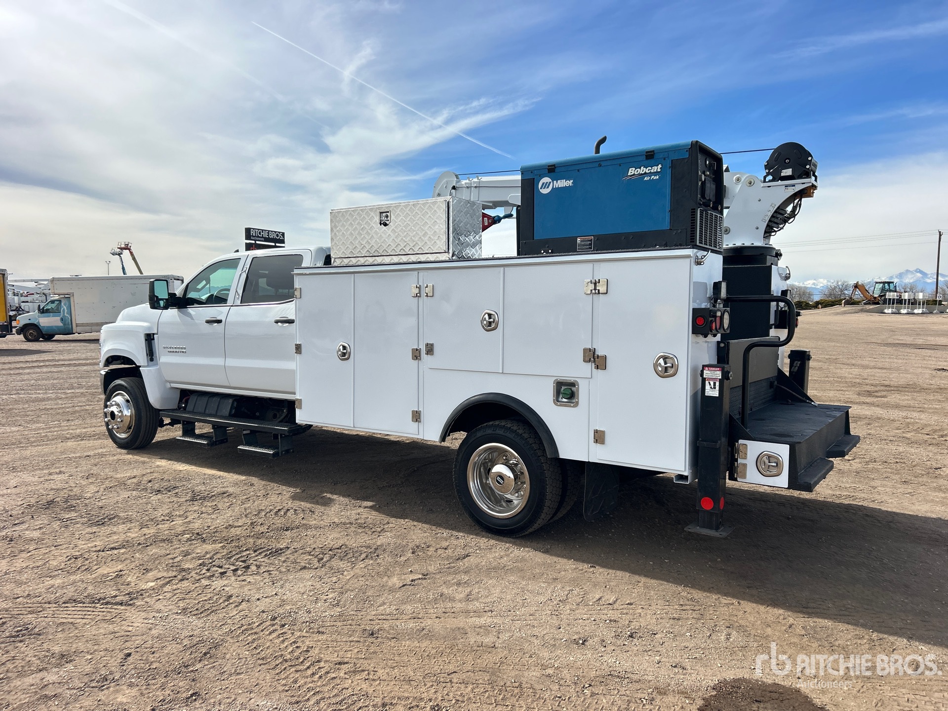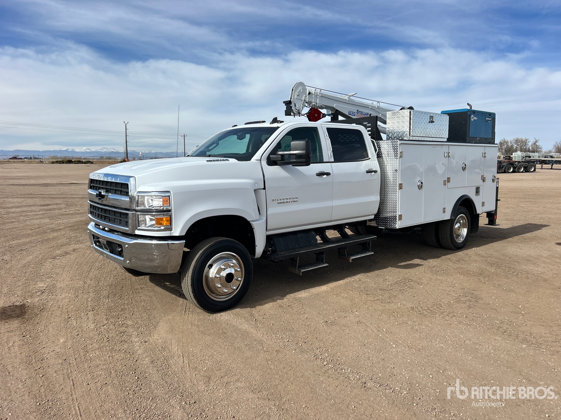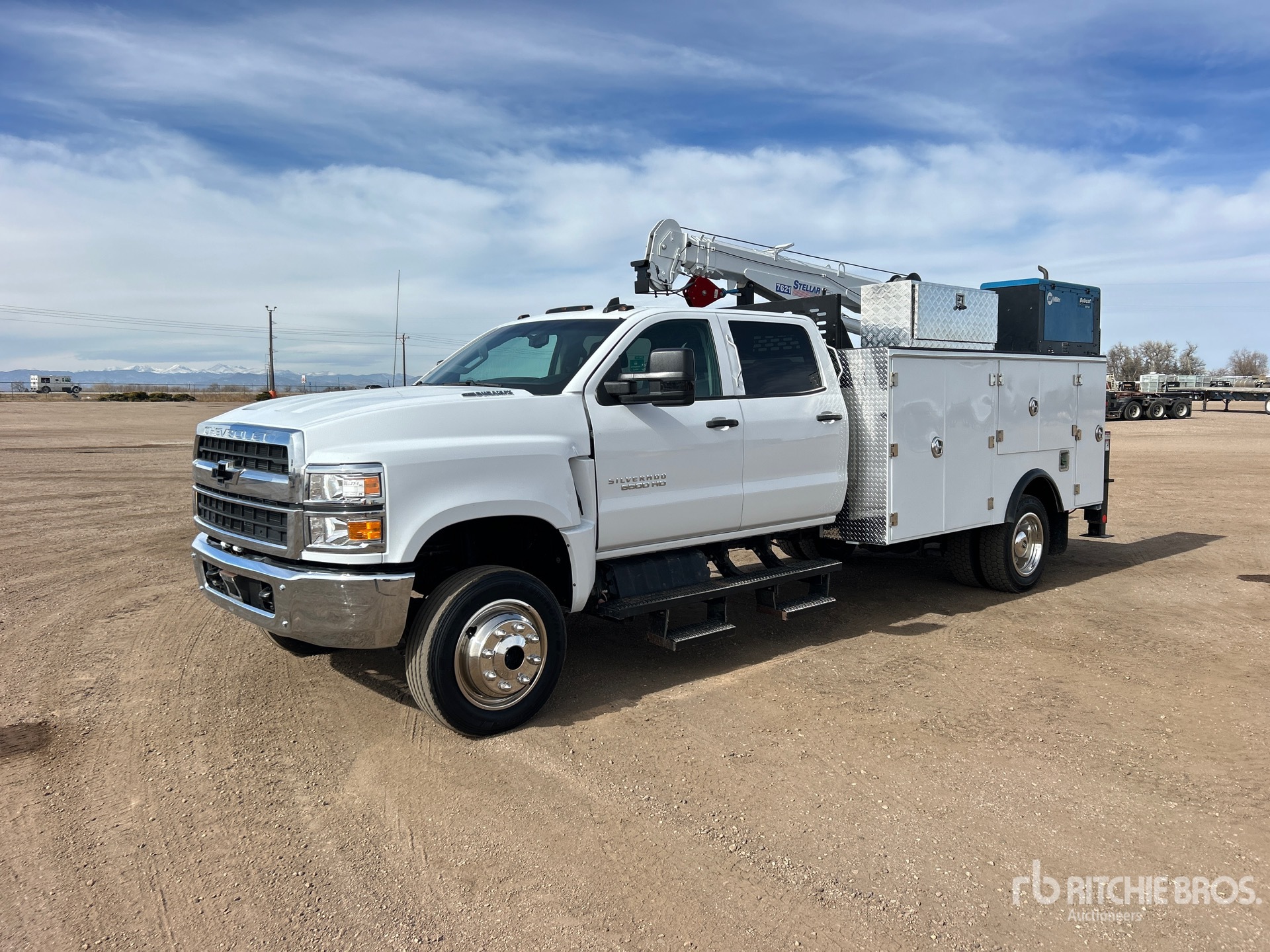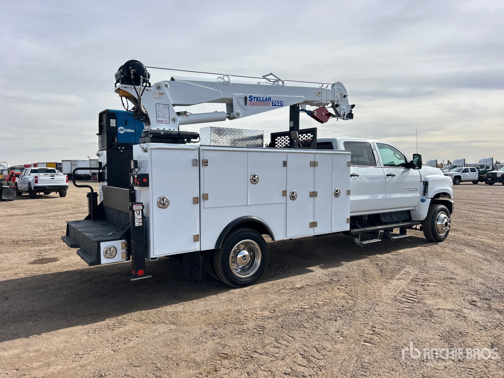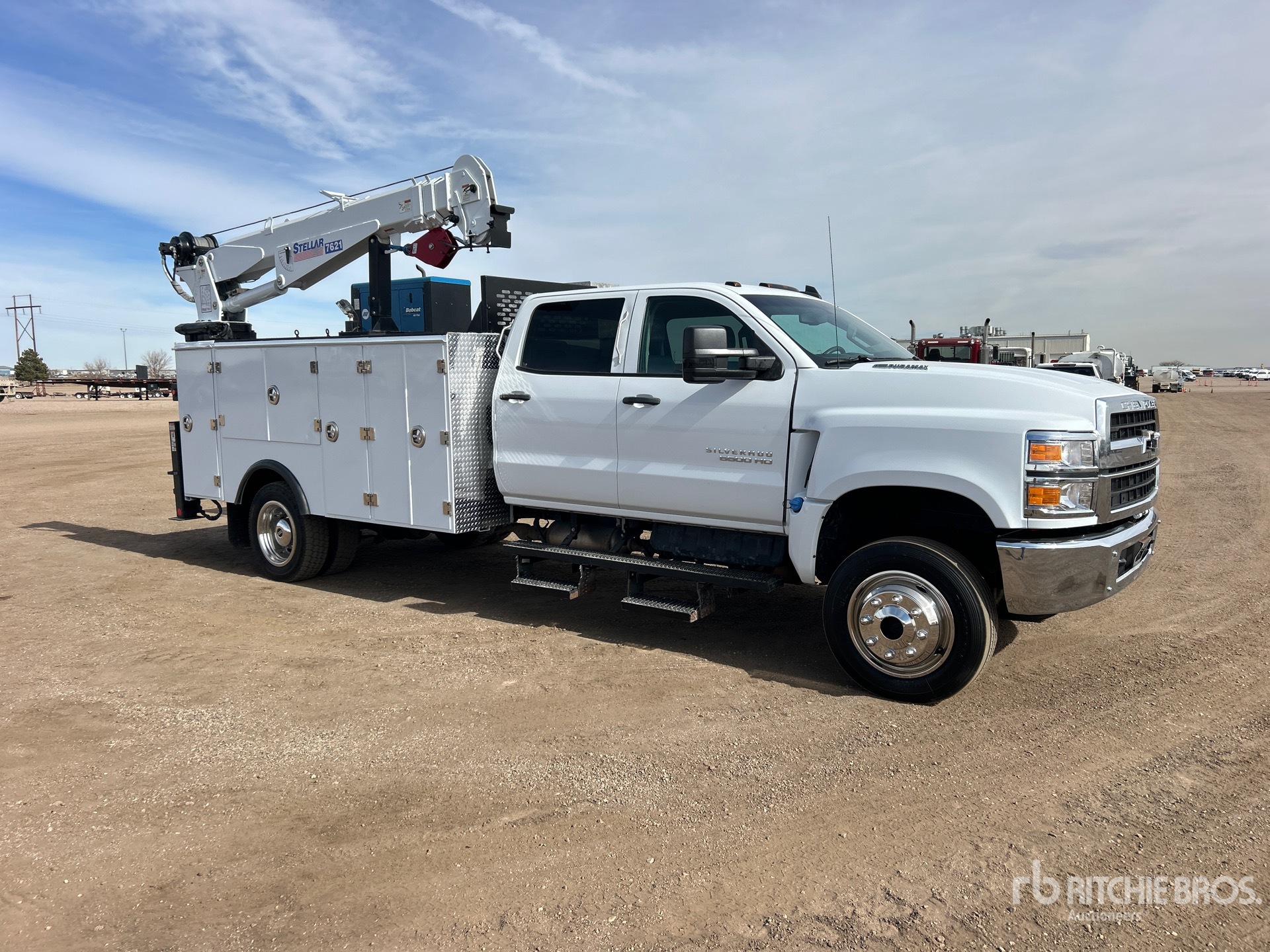 Located in Lane 8 Spot 5, International 350 6.6 L Diesel 350 hp Engine, 2022 US EPA Label, Requires Diesel Exhaust Fluid, 1458 Engine hrs, Engine Brake, Automatic Transmission, 7500 lb Front Axle, 15000 lb Rears, 22500 lb GVWR, 225/70R19.5, Spring Suspension, 199 in Wheelbase, PTO, 11 ft Body, Hydraulic Stabilizers, Stellar 7621 7500 lb 3 Section Hydraulic Crane, Wireless Remote Control, Air Hose Reel, Miller Bobcat 200 195 A Gasoline 3-in-1 Welder