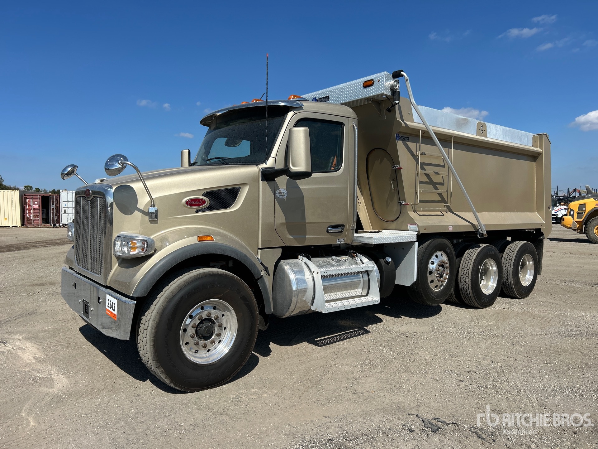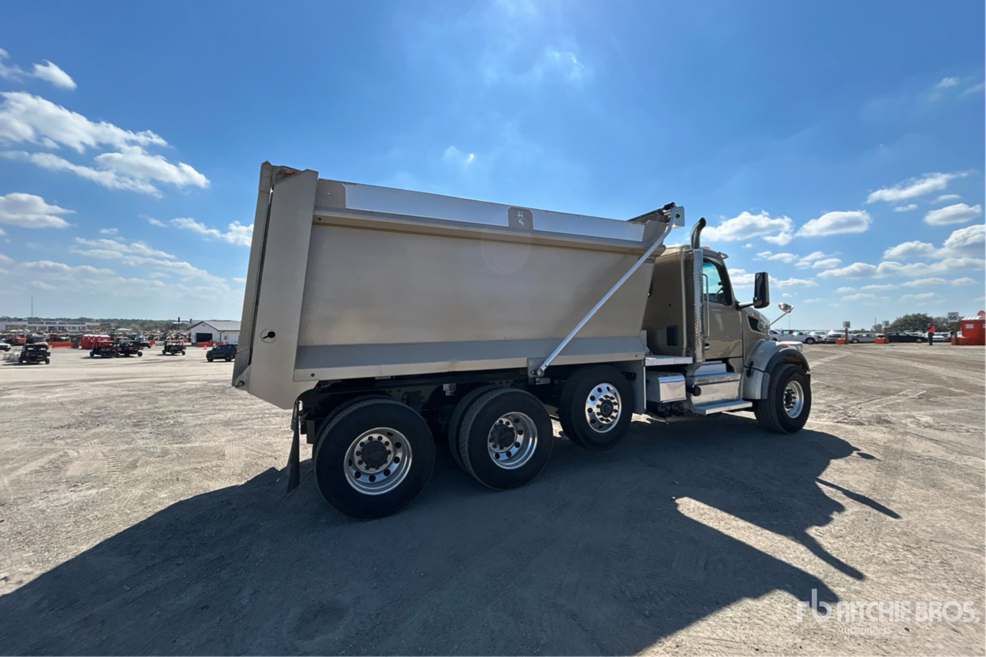Located in Lane 65 Spot 4, Paccar Diesel Engine, Requires Diesel Exhaust Fluid, 4359 Engine hrs, Engine Brake, Automated Transmission, Double Differential Locks, 20000 lb Front Axle, 46000 lb Rears, 78350 lb GVWR, Air Ride Cab, Aluminum Wheels, 425/65R22.5 Front Tires, 11R22.5 Rear Tires, Steerable Air Lift Pusher Axle, Air Trac Air Ride Suspension, 230 in Wheelbase, PTO, 14 ft 7 in Long x 6 ft 2 in High Steel Body, Electric Roll Tarp, Equipment-from-Daniel-Mullins-Trucking