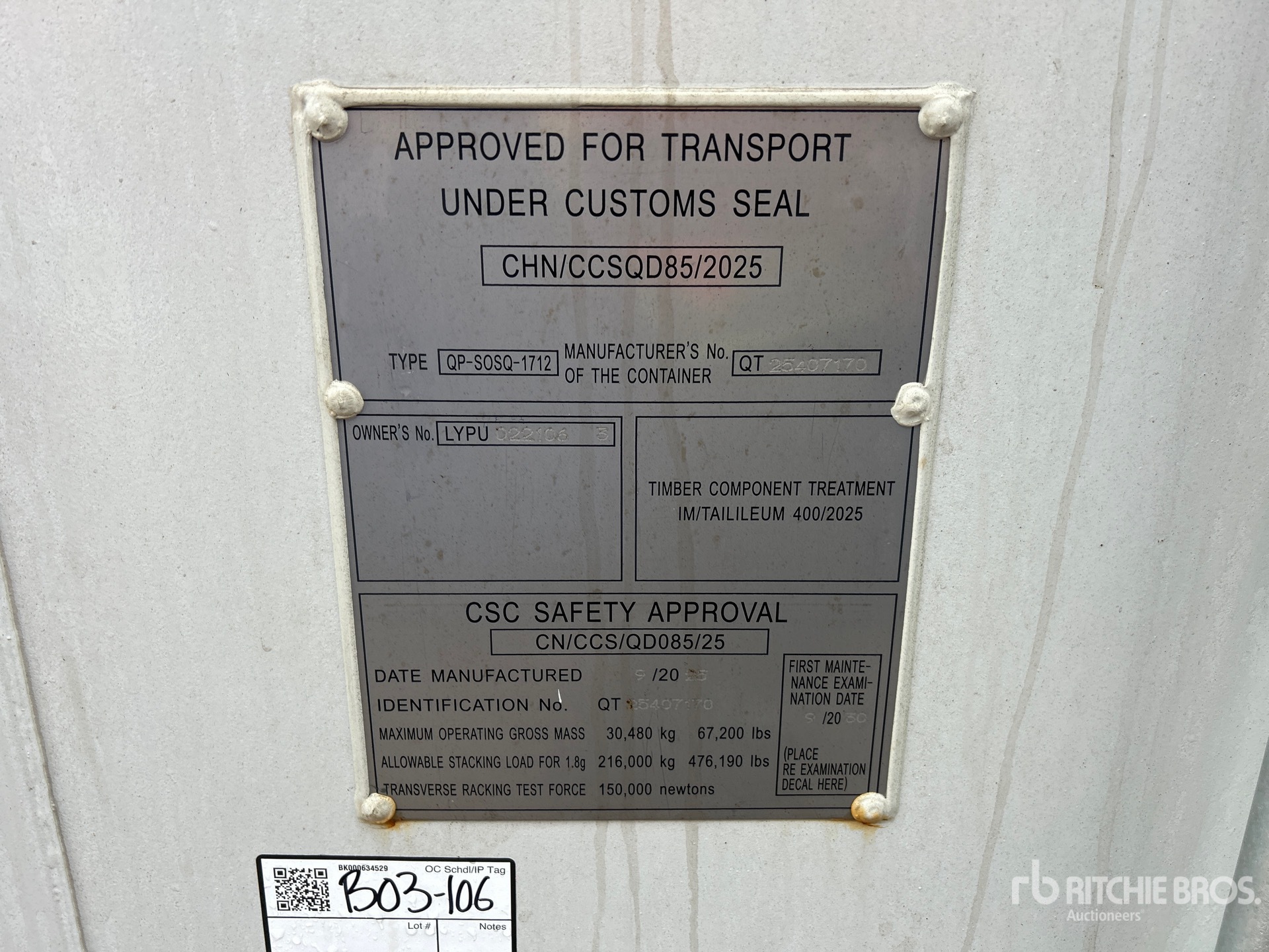 Podane wymiary mają jedynie charakter szacunkowy. Rzeczywiste wymiary z ładunkiem mogą się różnić w zależności od wysokości ciężarówki/przyczepy oraz konfiguracji/pozycji załadowanej maszyny. Obowiązkiem nabywcy jest pomiar wszystkich ładunków przed opuszczeniem naszego placu aukcyjnego, aby upewnić się, że ładunek jest bezpieczny podczas transportu. Wszystkie pomiary powinny zostać zweryfikowane przez nabywcę. Nie należy polegać na tych pomiarach do celów transportowych.