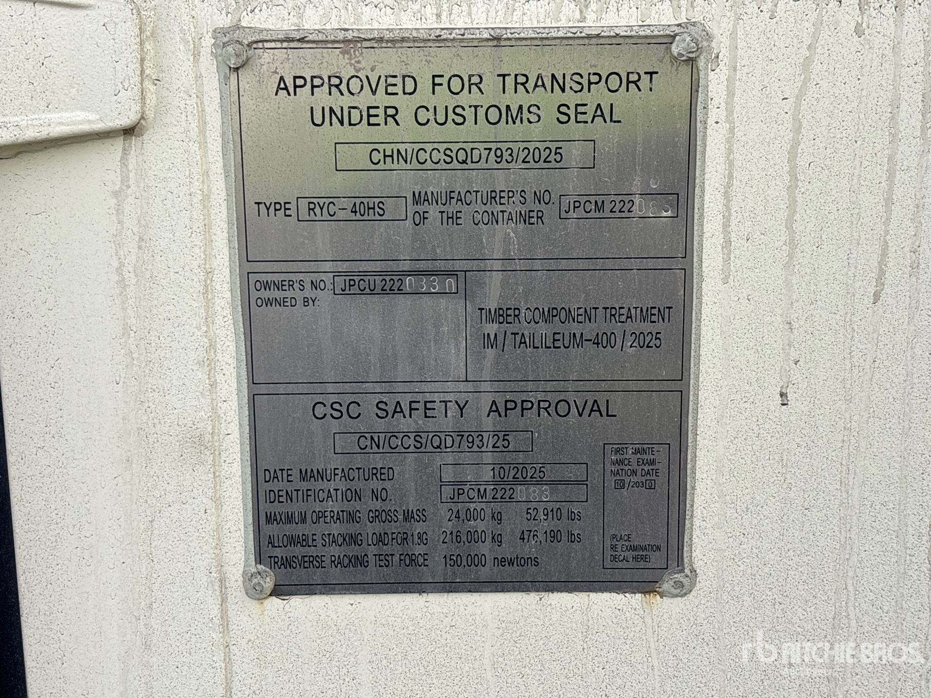 Podane wymiary mają jedynie charakter szacunkowy. Rzeczywiste wymiary z ładunkiem mogą się różnić w zależności od wysokości ciężarówki/przyczepy oraz konfiguracji/pozycji załadowanej maszyny. Obowiązkiem nabywcy jest pomiar wszystkich ładunków przed opuszczeniem naszego placu aukcyjnego, aby upewnić się, że ładunek jest bezpieczny podczas transportu. Wszystkie pomiary powinny zostać zweryfikowane przez nabywcę. Nie należy polegać na tych pomiarach do celów transportowych.