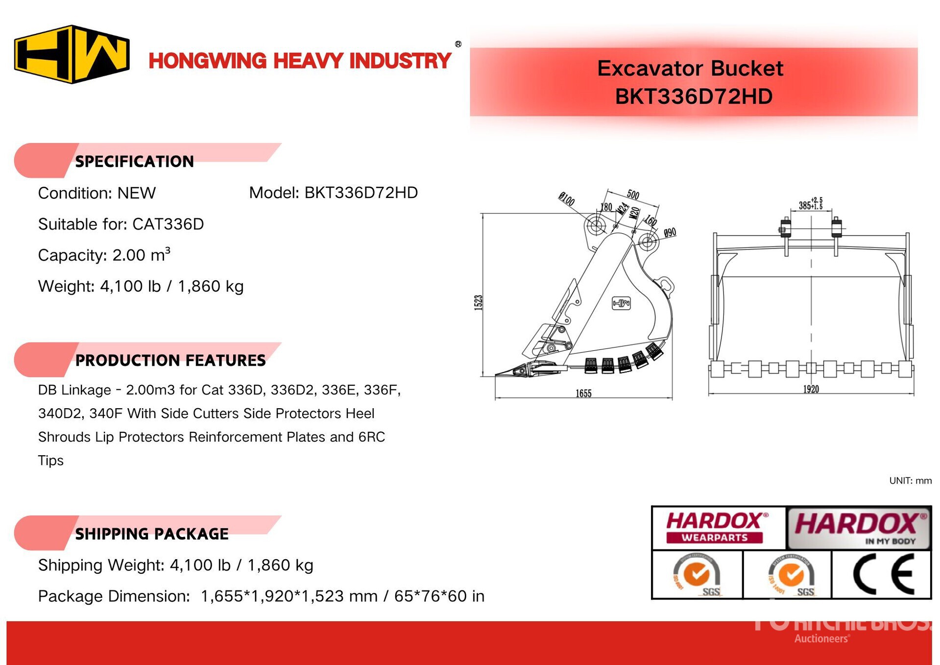 2026 HW BKT336D72HD 72 in 2.00 cyd Digging Łyżka do koparki - Fits Cat 336D (Unused)
