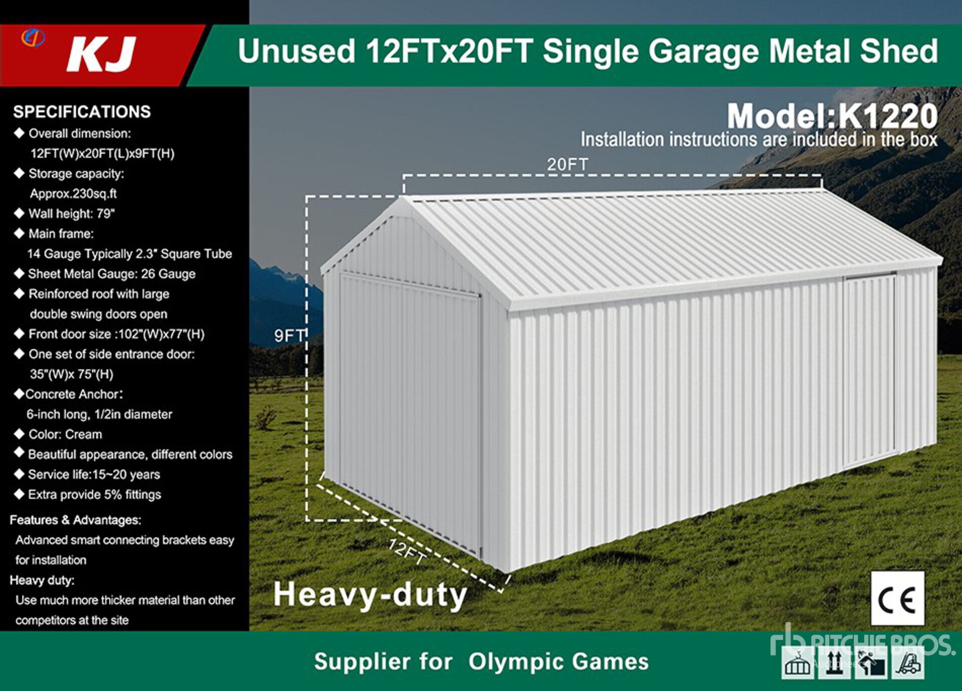 2026 KJ K1220 12 ft x 20 ft Metal Garage (Unused)