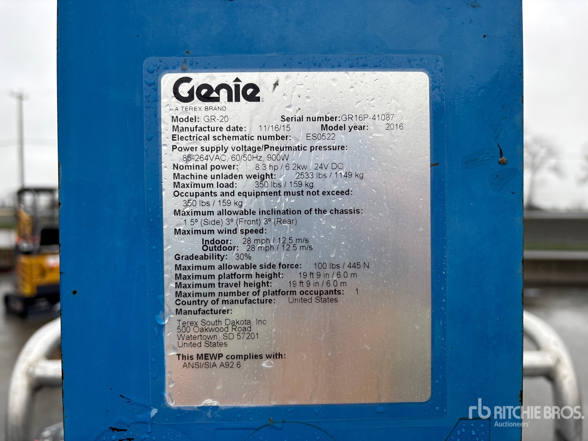 Szczegółowe informacje o sprzęcie mają ograniczony zakres, a firma Ritchie Bros. Auctioneers nie sprawdzała żadnych aspektów ani komponentów urządzenia innych niż wyraźnie określone w niniejszym dokumencie. O ile nie zostało to wyraźnie stwierdzone, nie składamy żadnych oświadczeń ani gwarancji, wyraźnych lub dorozumianych, dotyczących sprzętu lub jego komponentów, w tym między innymi oświadczeń lub gwarancji dotyczących funkcjonalności lub zgodności z jakąkolwiek normą bezpieczeństwa bądź wymogami jakiegokolwiek właściwego organu lub organu regulacyjnego, przydatności do określonego celu lub przydatności handlowej. Zdecydowanie zaleca się przeprowadzenie własnej szczegółowej inspekcji sprzętu przed złożeniem oferty.