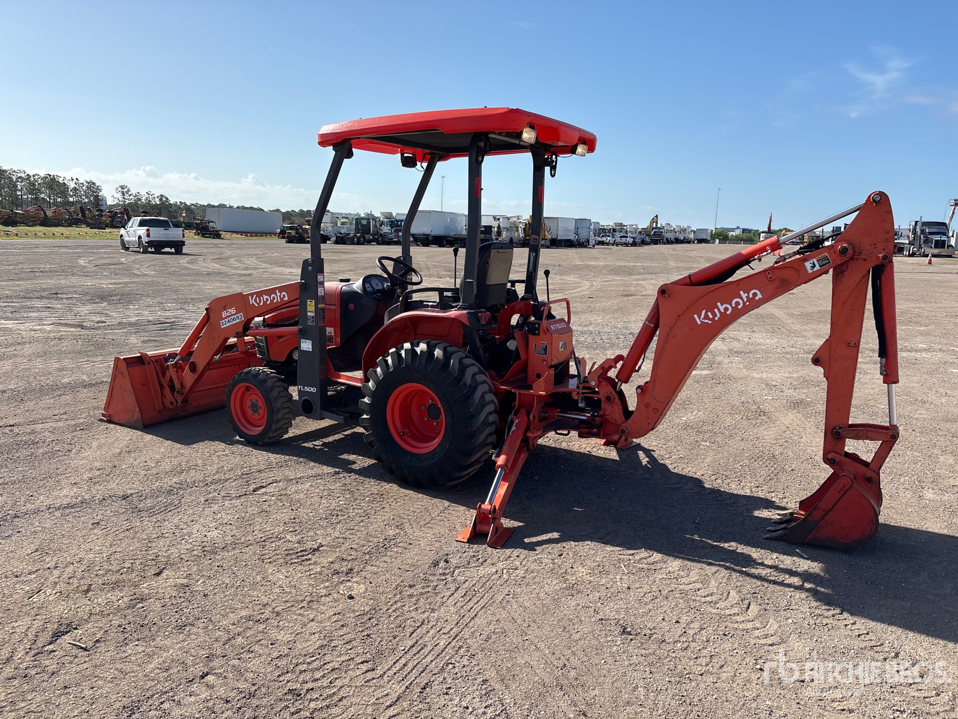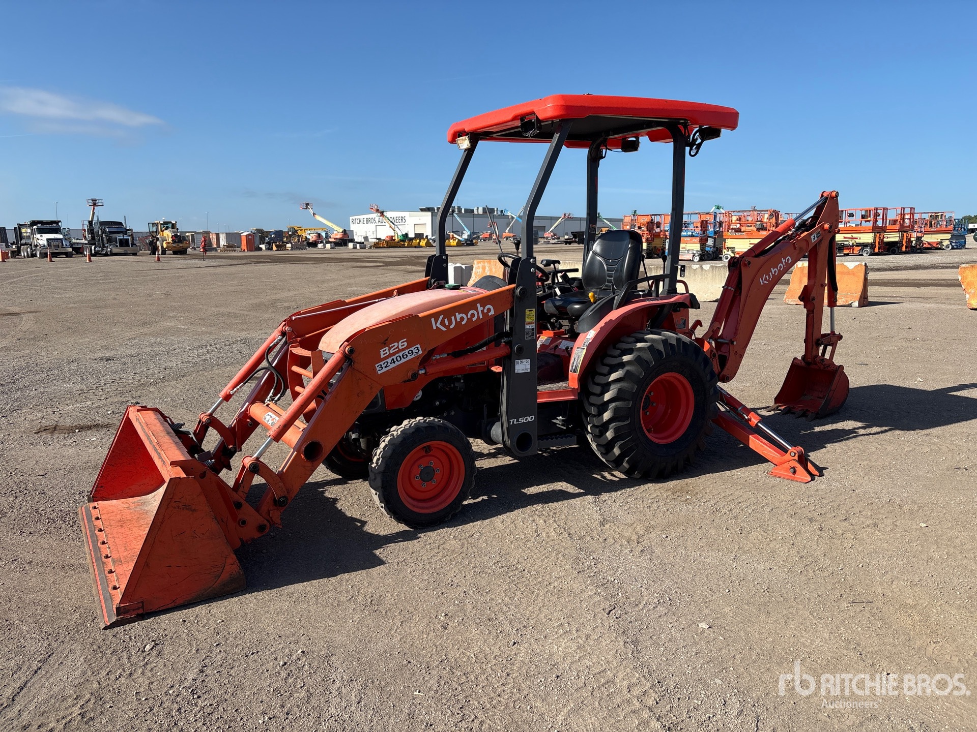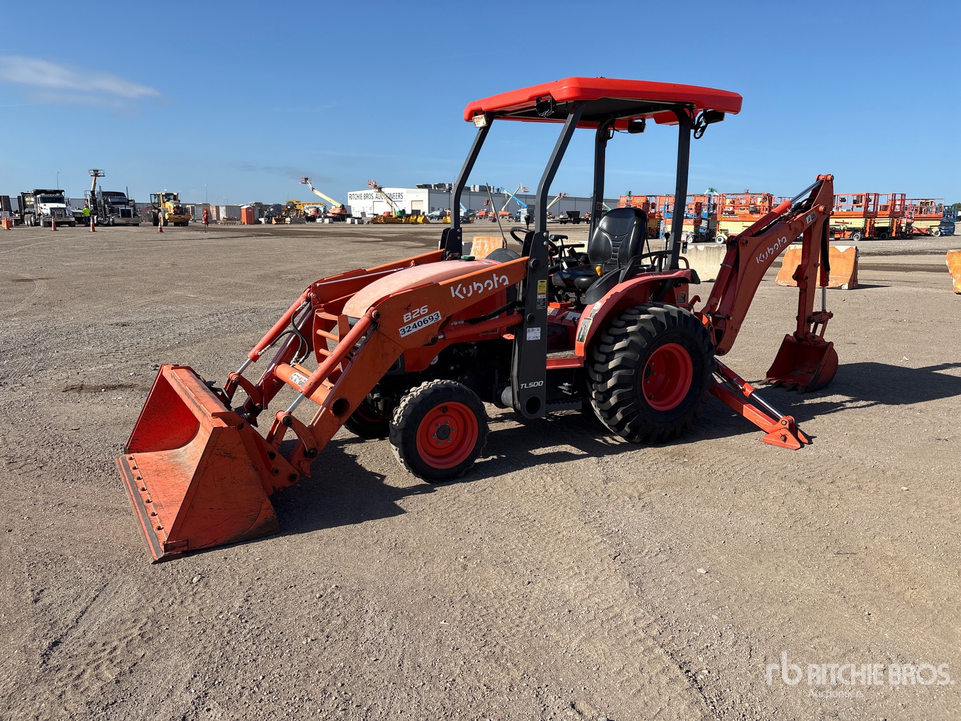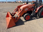 Canopy, Kubota B26 Loader, 59 in Bucket, Kubota Backhoe Attachment With 18 in Bucket, 23x8.5-12 Front Tires, 12.4-16 Rear Tires